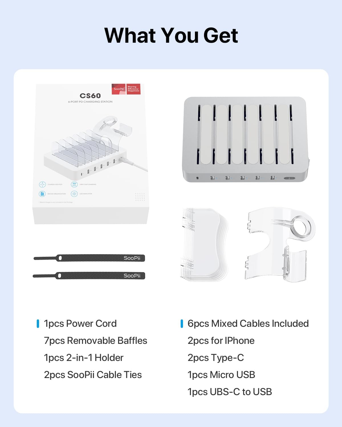 • Какво получавате в кутията: 1 SooPii премиум зарядна станция, 7 здрави протектора за телефони и таблети, 1 2 в 1 държач за преградна плоча за зарядно за i Watch и AirPods (зарядното за i Watch не е включено) и 6 къси кабела за зарядно (2 съвместими с iPhone и iPad, 2 Type-C, 1 Micro USB и 1 USB C към USB C) за ежедневна употреба, ръководство за потребителя.