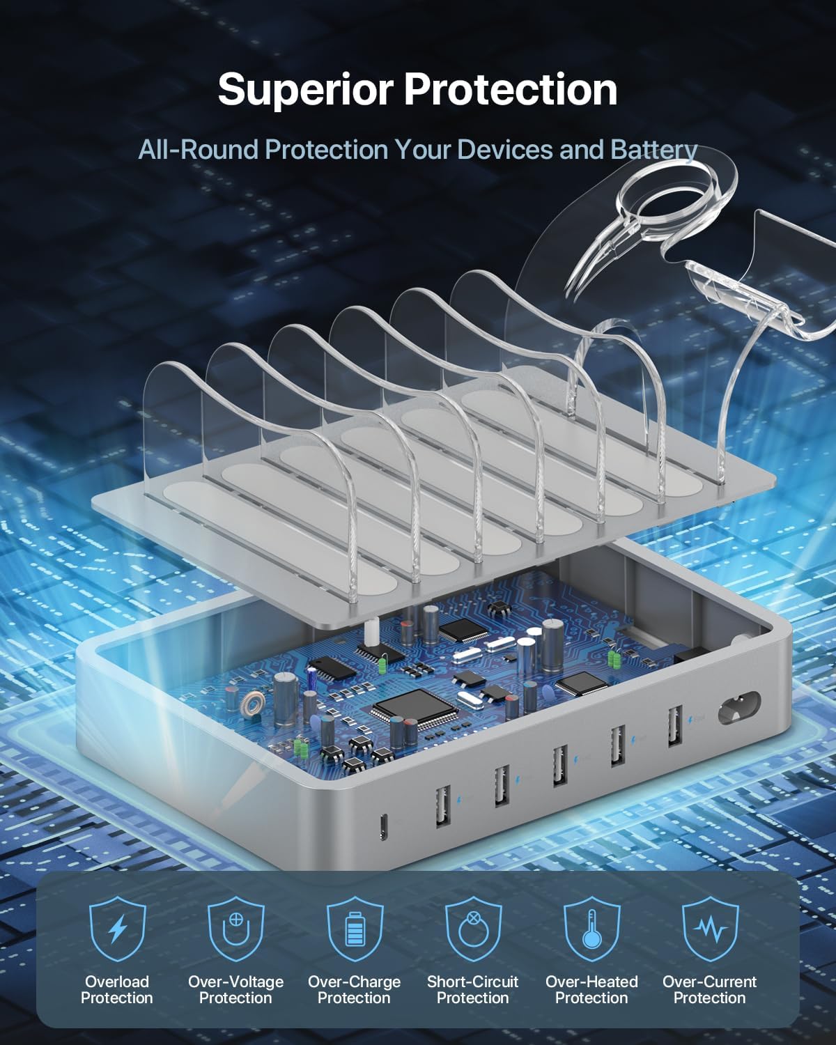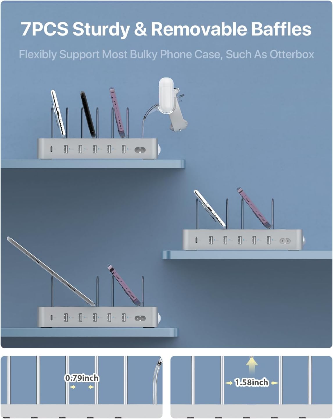 • ЗАРЕЖДАНЕ, ЧИСТОТА И ОРГАНИЗИРАНО - Край на заплетените кабели, без купчина зарядни устройства, всичко на едно място, чисто и организирано. Бял цвят с издръжливо матово покритие, светло син LED и сиви силикагел ленти правят тази зарядна станция истинска първокласна зарядна станция. Проектирана да се побере навсякъде: компания, офис, заседателна зала, дом, хол, спалня, кухня, хотел, ресторанти, класна стая.