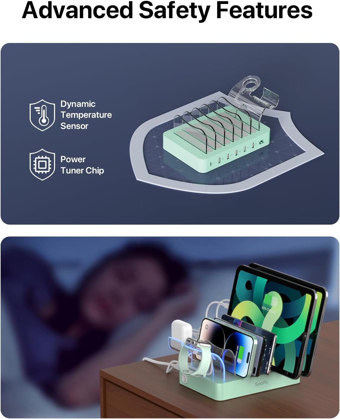SooPii USB зарядна станция 60W/12A, 6-портова докинг станция, органайзер за множество устройства с държач за I Watch, включени 6 кабела за телефони, таблети и други електронни устройства
