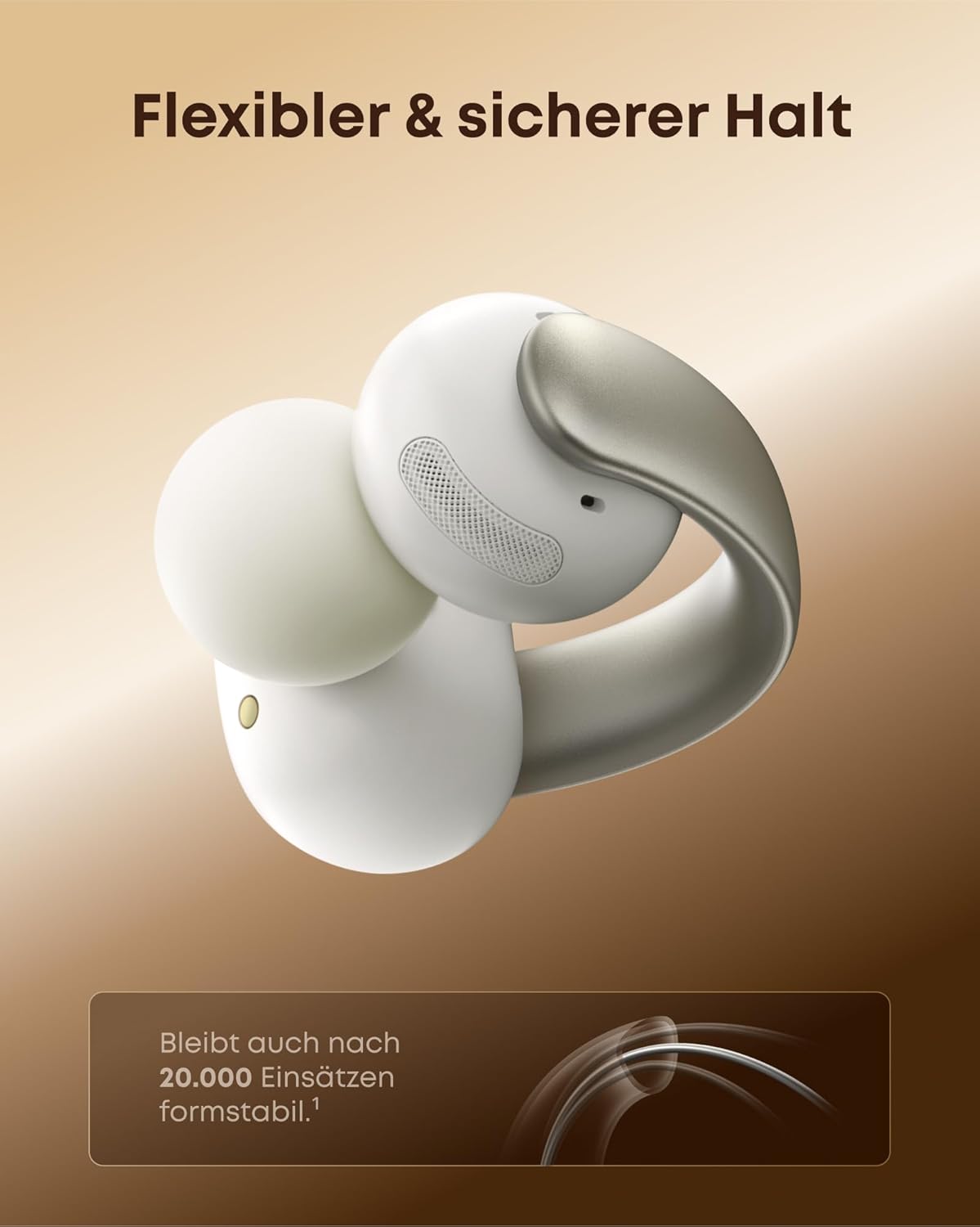 • Гъвкаво и сигурно задържане: Слушалките Soundcore AeroClip с щипка са с отворен пръстен, който може да издържи на 20 000 огъвания. Благодарение на леката си и гъвкава структура, те предлагат сигурно задържане през целия ден.