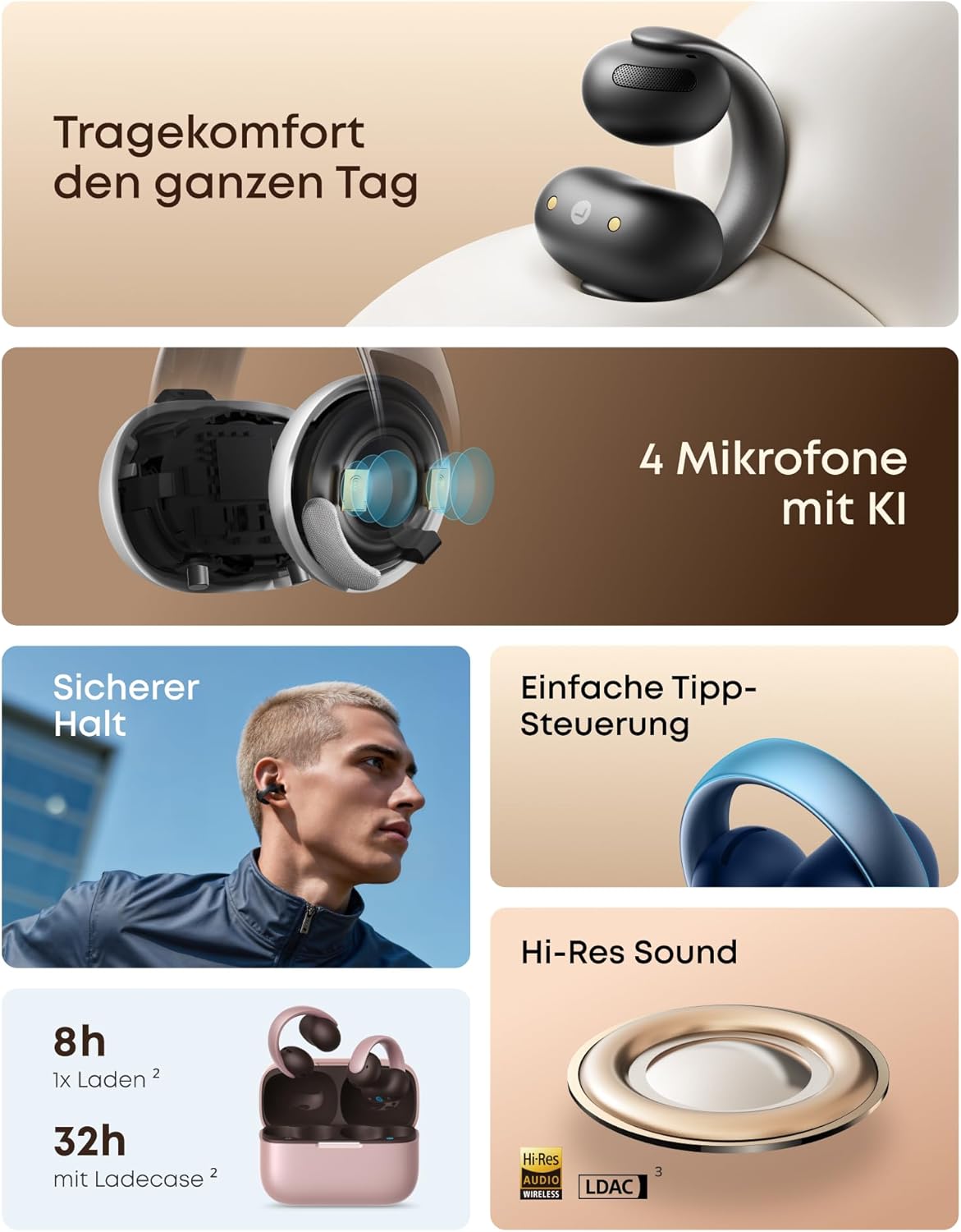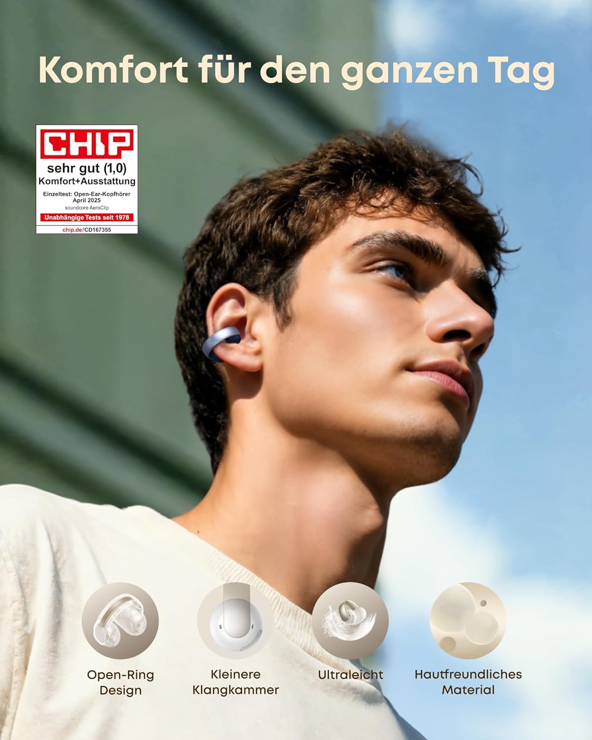 • Комфорт през целия ден: отворените слушалки Soundcore AeroClip впечатляват с удобен дизайн, който ви позволява да слушате любимата си музика с часове, без да усещате натиск.