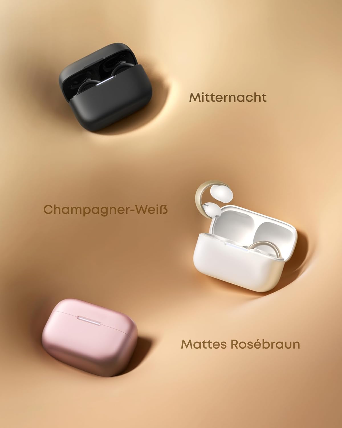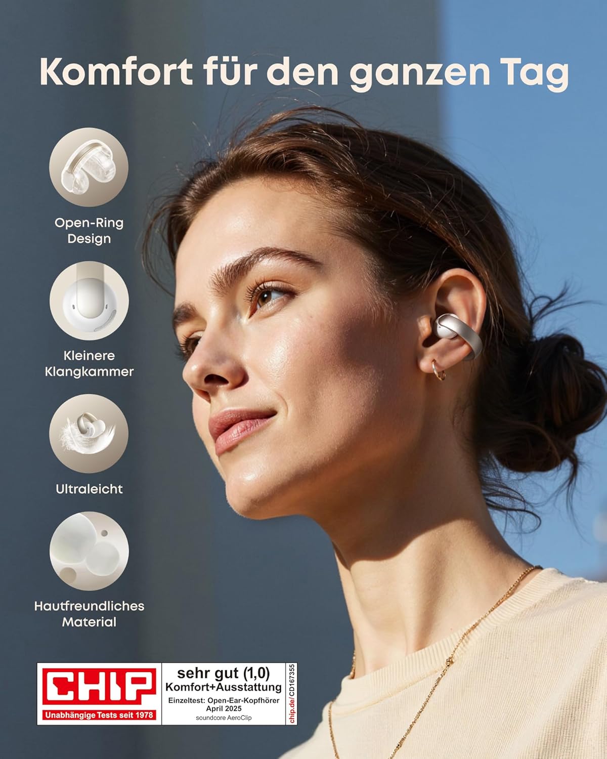 • Комфорт през целия ден: отворените слушалки Soundcore AeroClip впечатляват с удобен дизайн, който ви позволява да слушате любимата си музика с часове, без да усещате натиск.