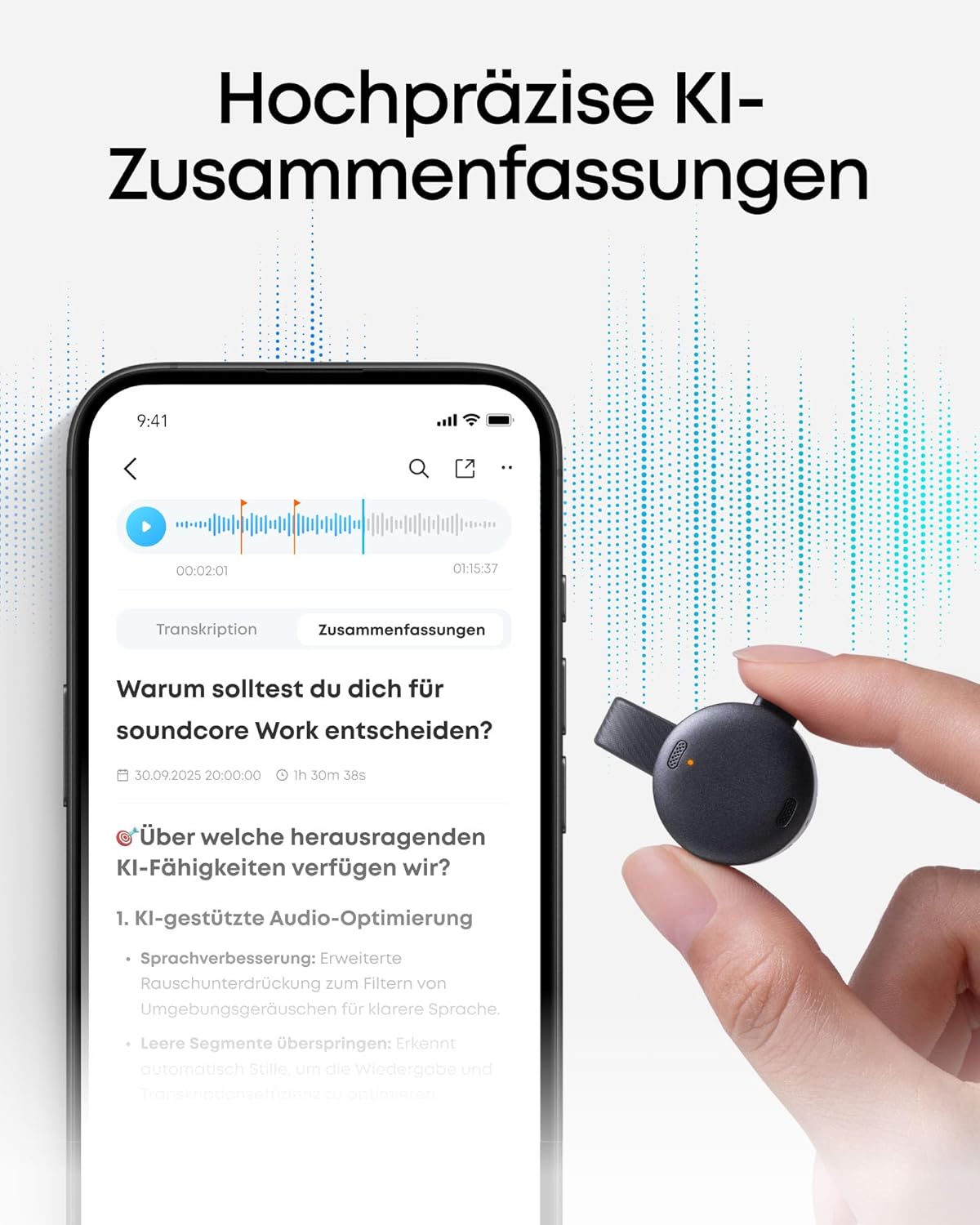 soundcore Work by Anker, Преносим AI гласов рекордер, Интелигентна AI транскрипция и комбинирани протоколи за срещи, Двоен накрайник за маркиране, Компактен, Защита на данните, Дълъг живот на батерията (Черен)