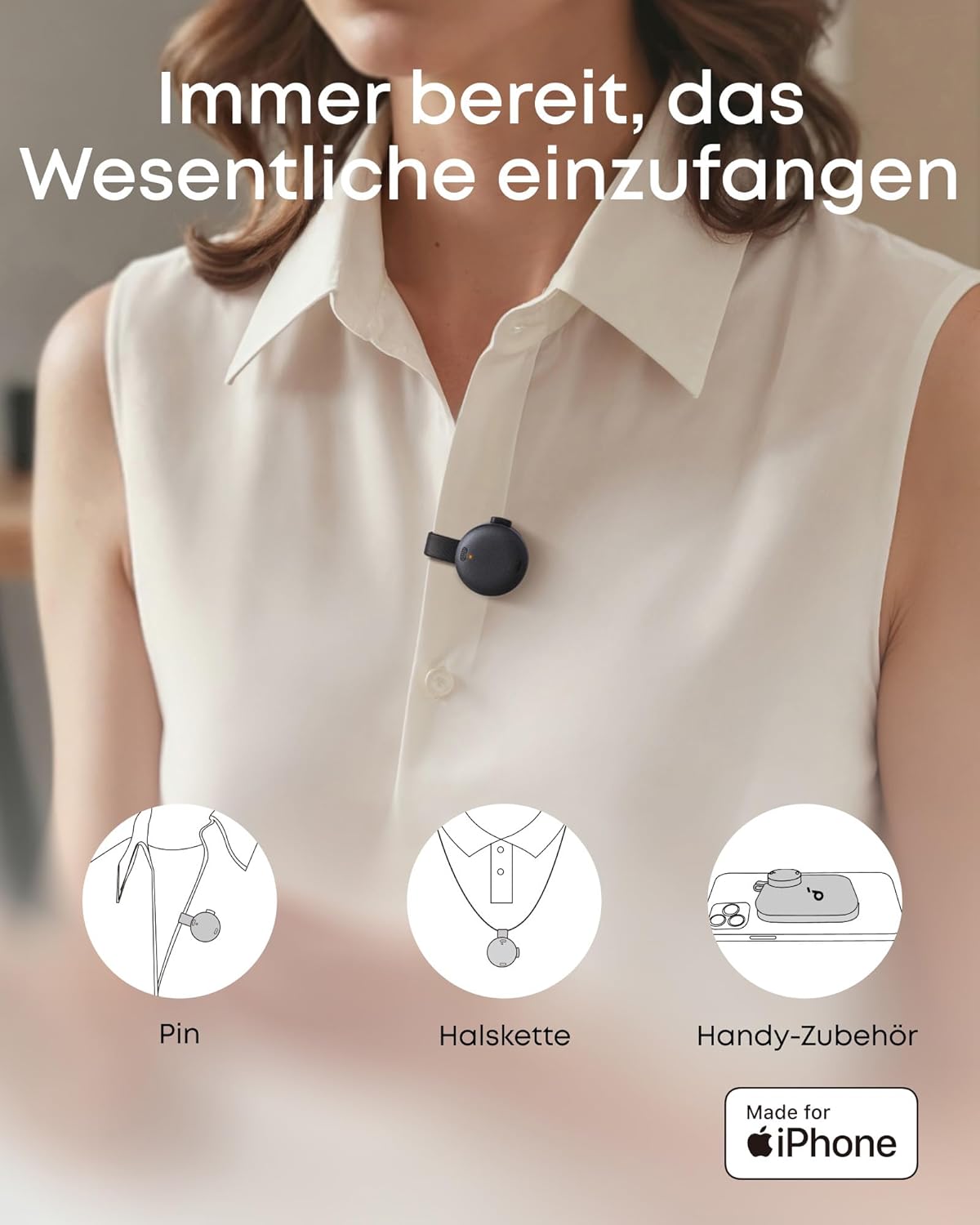 • Записвайте веднага: С тегло само 10 г и диаметър 23,2 мм, рекордерът може да се прикрепи към дрехи, да се окачи на врата ви или да се закачи зареждащата кутия (включително микро) към мобилния ви телефон. Записът започва веднага само с едно натискане на бутон.