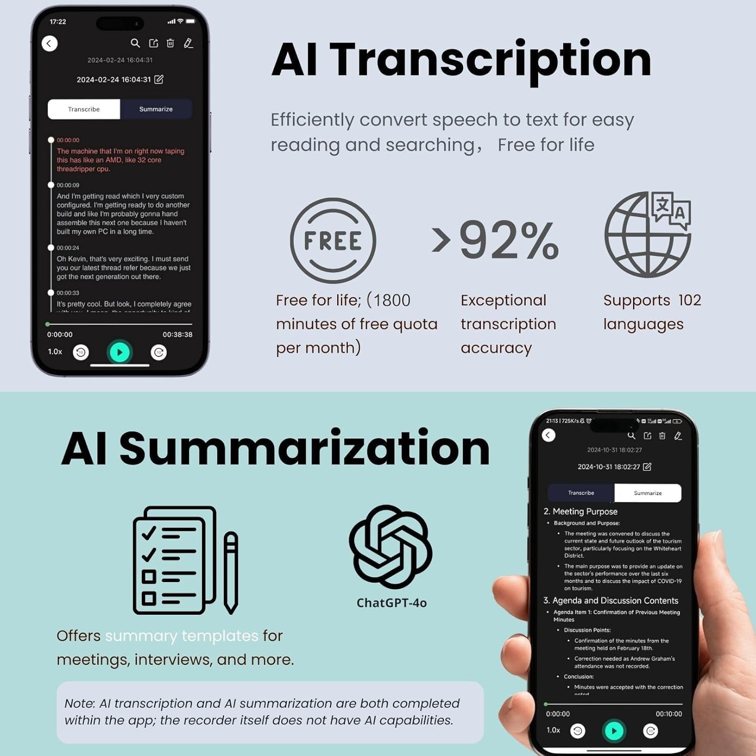 • Преносим дизайн с AI транскрипция: С тегло само 28 г и дебелина от 7 мм, цифровият диктофон е изключително преносим. Насладете се на 1800 минути високопрецизни услуги за преобразуване на глас в текст и обобщения на месец, поддържани от OpenAI Whisper и GPT-4o. Тази технология позволява безпроблемна транскрипция на 102 езика и улеснява потребителите да създават безпроблемно обобщения, дневници и списъци със задачи, което значително увеличава ежедневната производителност.