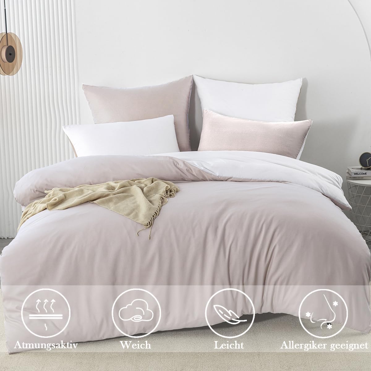 Спално бельо 135 x 200 см, 2 комплекта спално бельо в бежово/бяло, микрофибър, двулицево спално бельо 135 x 200 см, меко и не се глади, 1 калъф за завивка + 1 калъфка за възглавница 80 x 80 см с цип