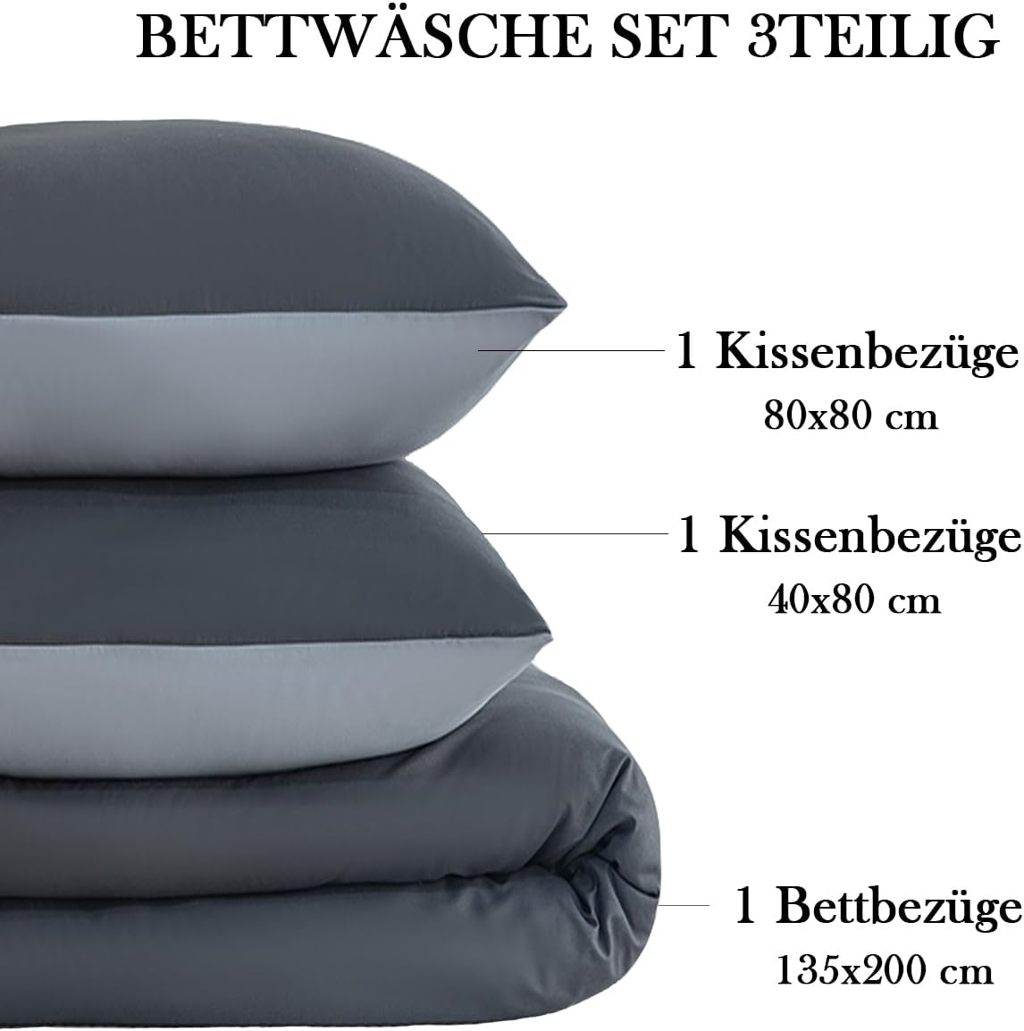 Спално бельо 135 x 200 см, 3 комплекта спално бельо, антрацит/сиво, микрофибър, двулицево, 135 x 200 см, меко и не се глади, 1 калъф за завивка + 1 калъфка за възглавница 80 x 80 см + 1 калъфка за възглавница 40 x 80 см