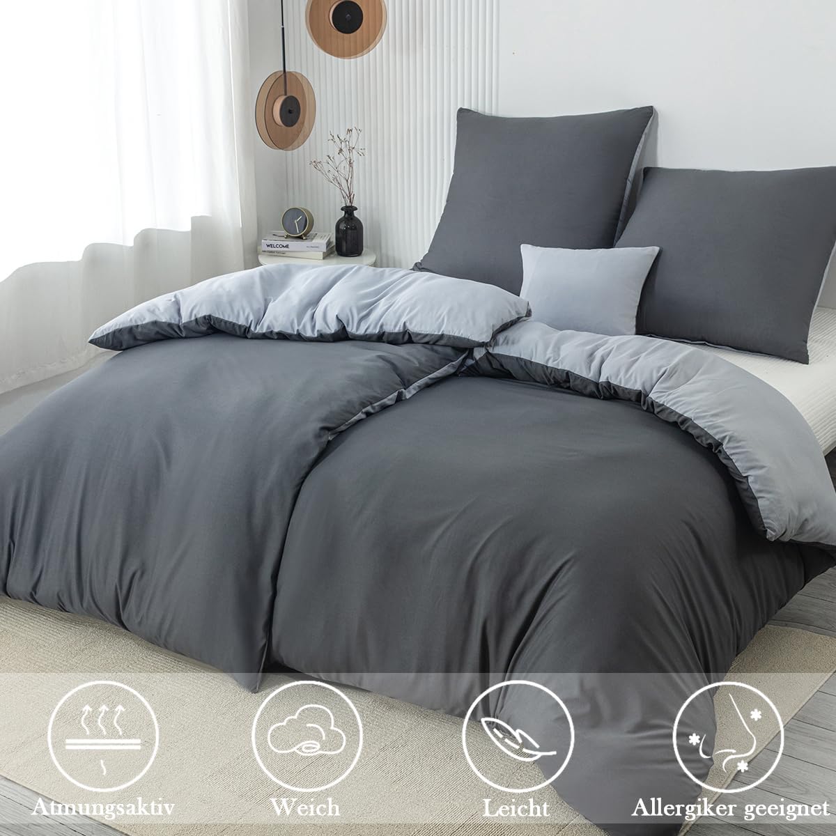 Спално бельо 135 x 200 см, 4 части, антрацит/сиво, двулицево спално бельо от микрофибър, 135 x 200 см, 4 части, мек и негладящ ​​се калъф за завивка 2 + калъфка за възглавница 2, 80 x 80 см с цип