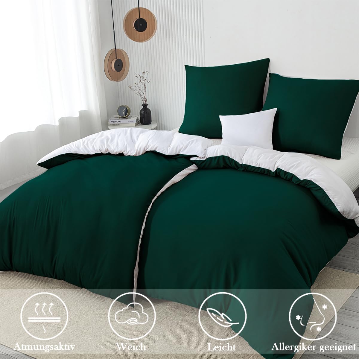 Спално бельо 135 x 200 см, 4 части, тъмнозелено/бяло, Микрофибър, двустранно спално бельо 135 x 200 см, 4 части, мек и негладящ ​​се калъф за завивка 2 + калъфка за възглавница 2, 80 x 80 см с цип