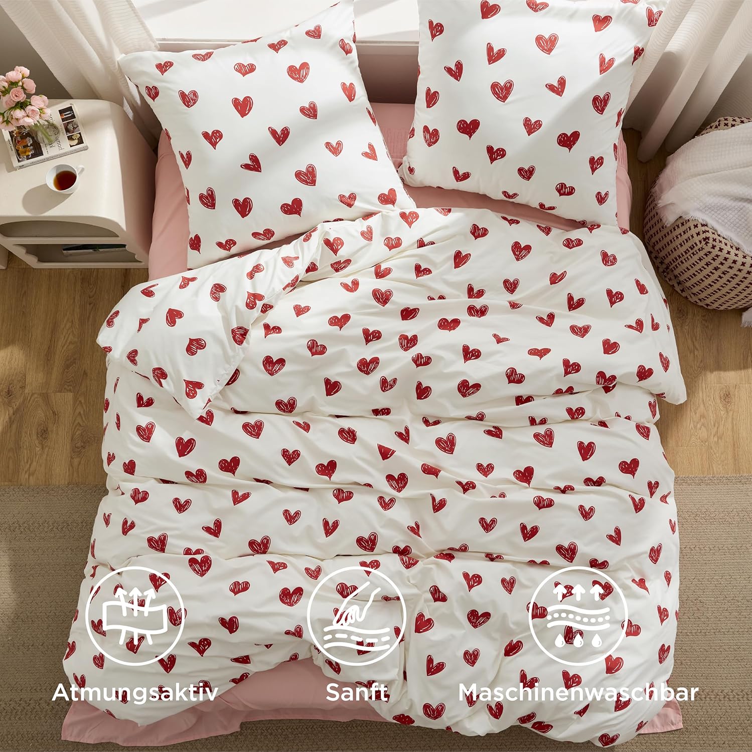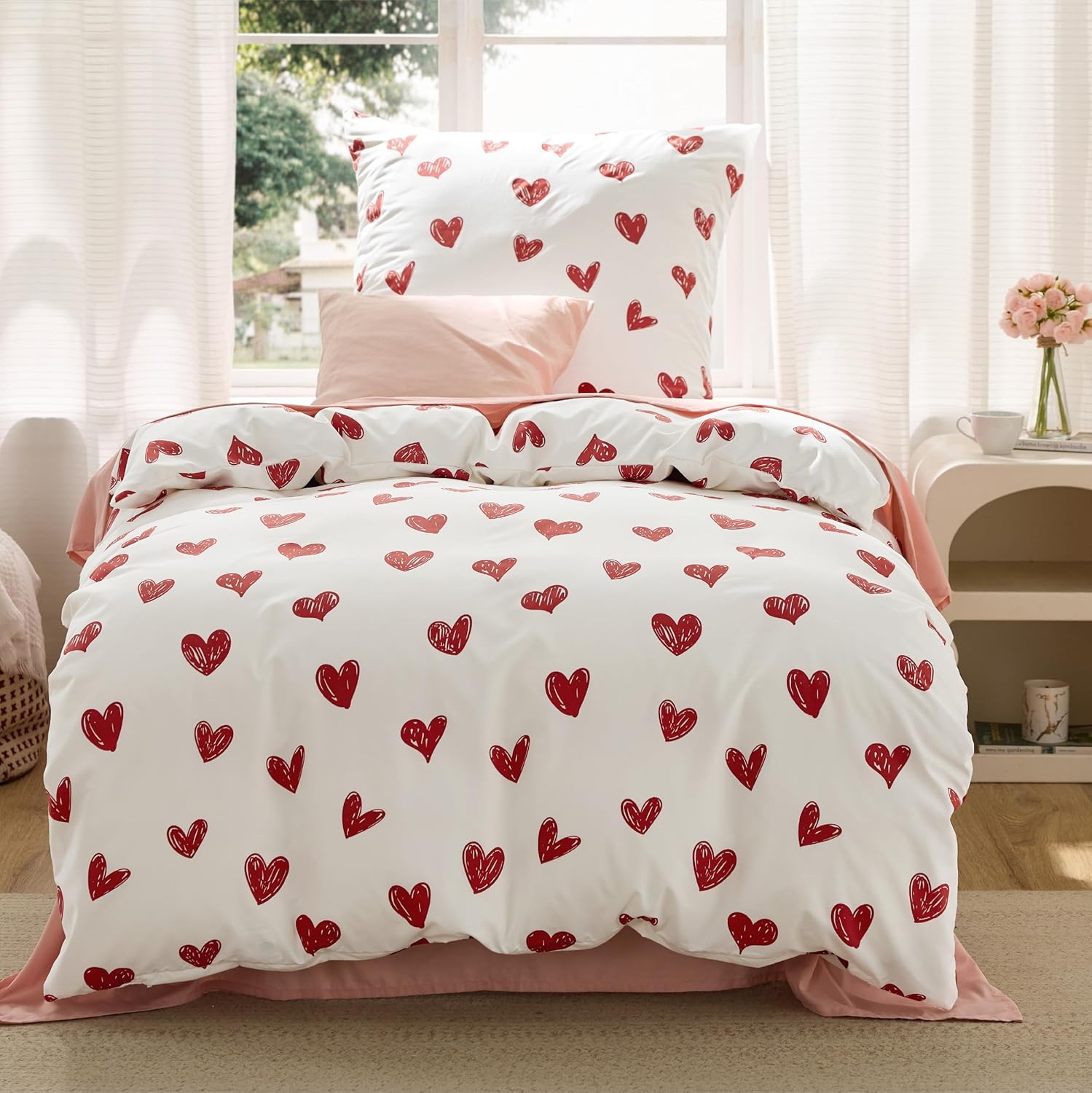 Спално бельо BEDSURE 135 x 200 см 2 части Сърца - Комплекти спално бельо Бял калъф за завивка 135 x 200 см с 1 калъфка за възглавница 80 x 80 см, Oeko-Tex спално бельо с шарка Червено сърце с цип