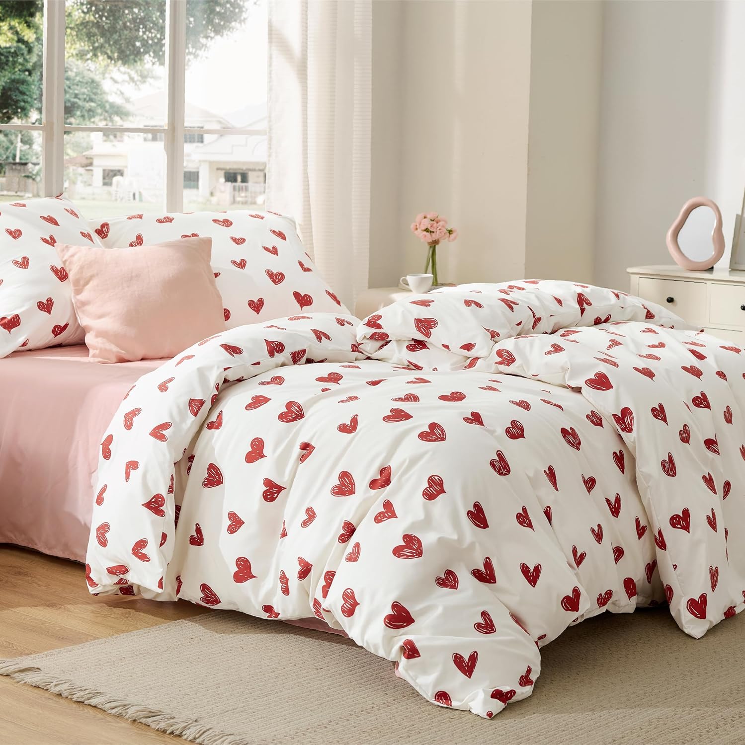 Спално бельо BEDSURE 135 x 200 см 4-частично сърца - Комплекти спално бельо Бял калъф за завивка 135 x 200 см Комплект от 2 калъфки за възглавници 80 x 80 см, Oeko-Tex Спално бельо с десен червено сърце с цип