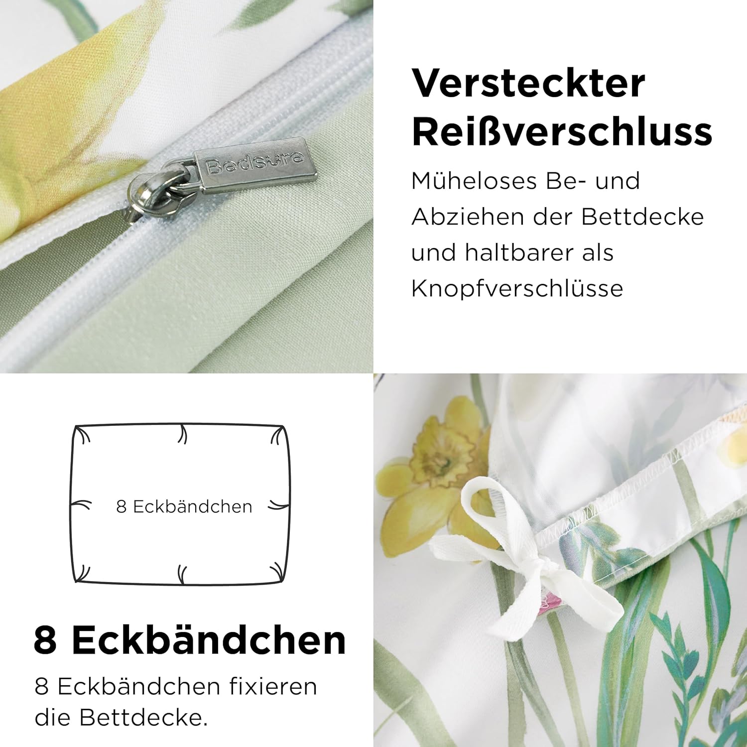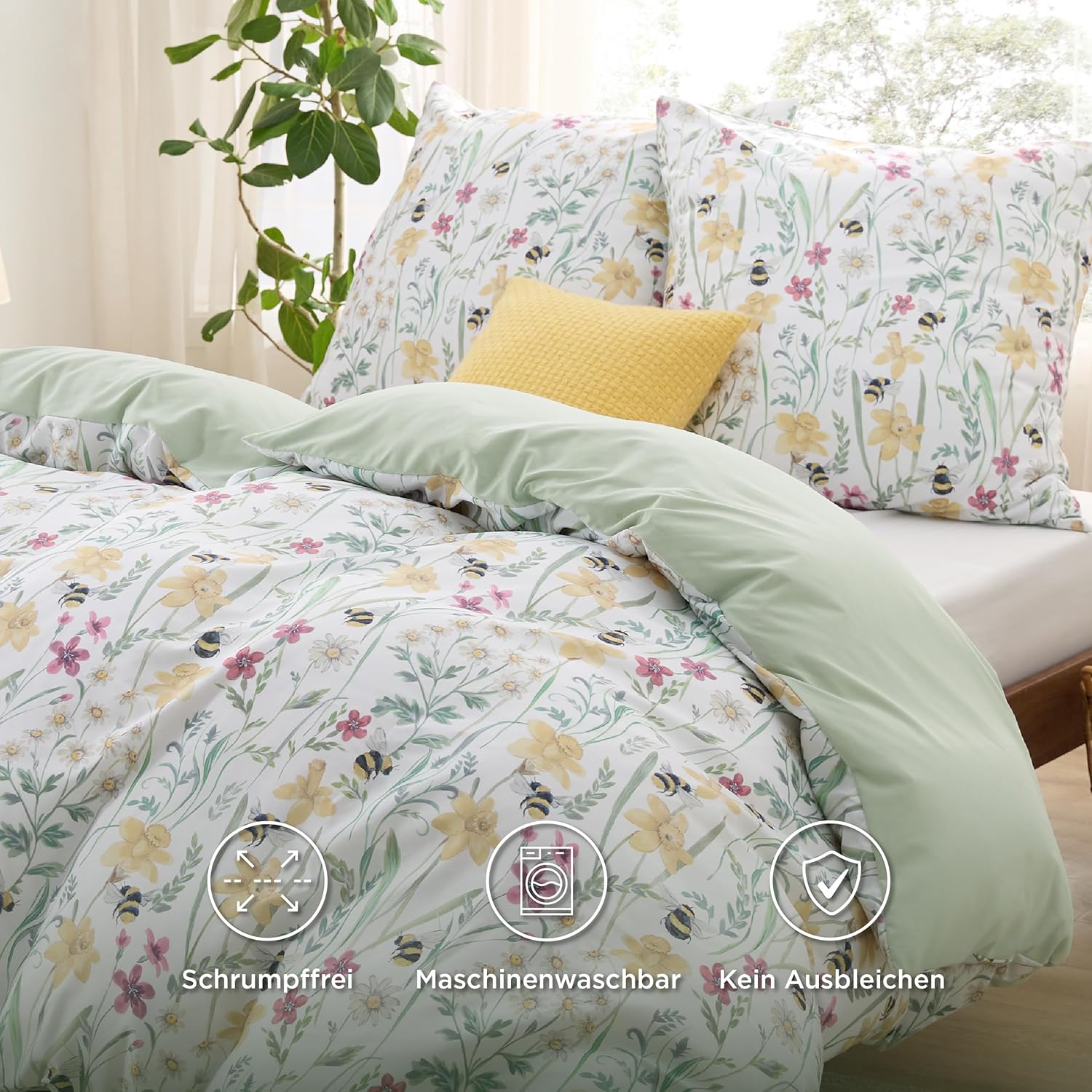 Спално бельо BEDSURE 135 x 200 см калъф за завивка от 2 части - Комплекти спално бельо 135 x 200 см с калъфка за възглавница 80 x 80 см, Oeko-Tex двустранно спално бельо със зелени цветя и растителни мотиви за единично легло с цип