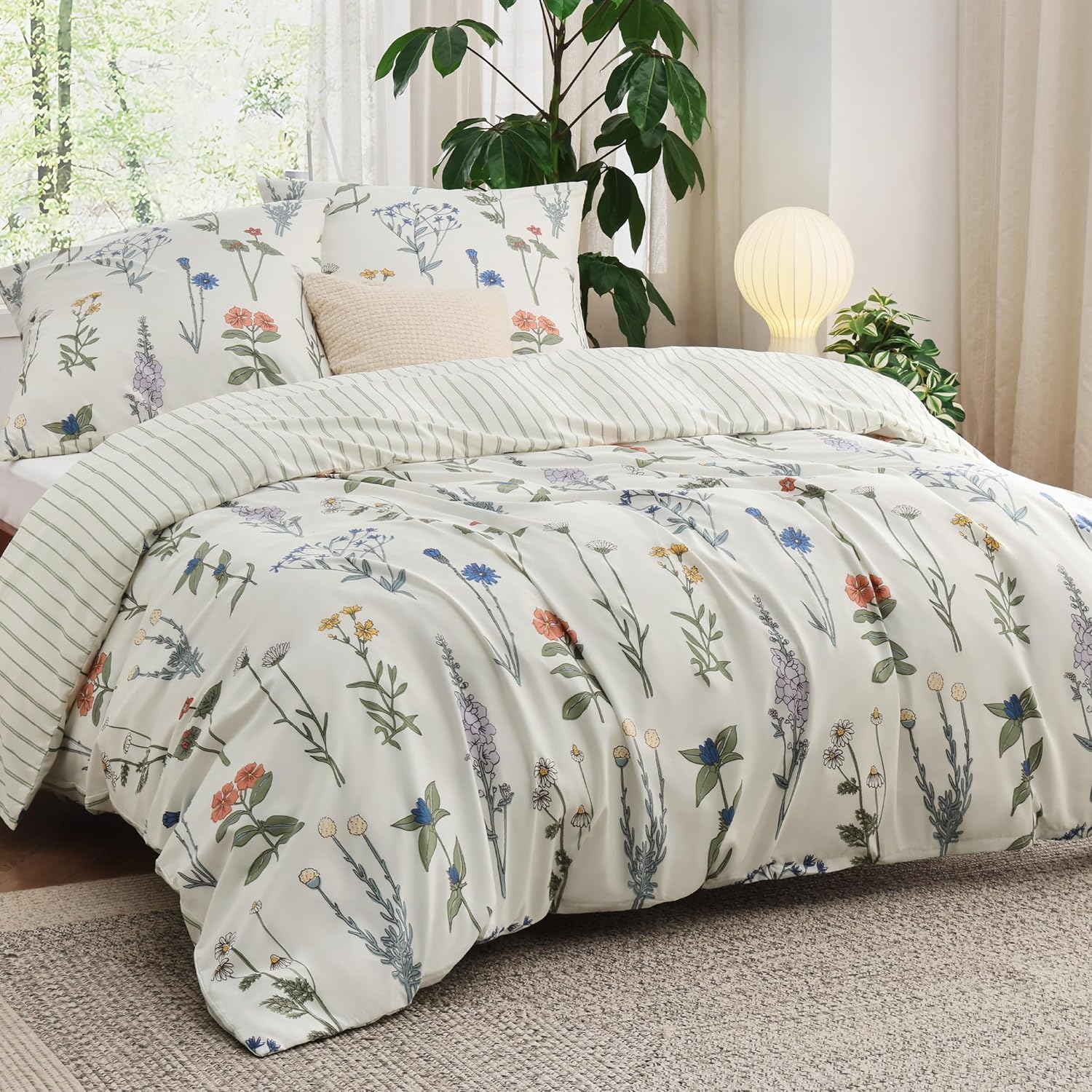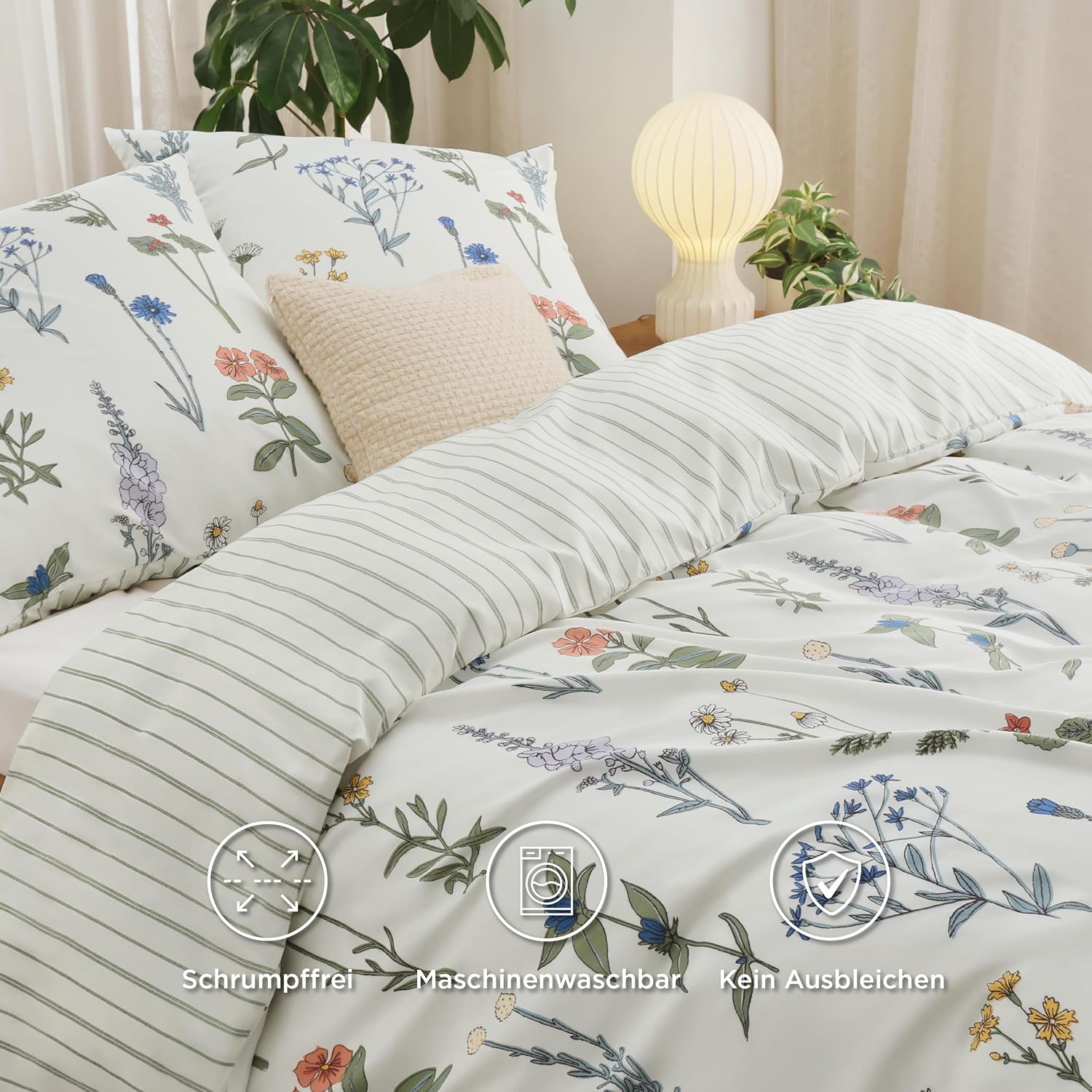 Спално бельо BEDSURE 200 x 200 см, 3 части, калъф за завивка - комплекти спално бельо 200 x 200 см с 2 калъфки за възглавници 80 x 80 см, Oeko-Tex бяло спално бельо с шарка на цветя и райета за двойно легло с цип