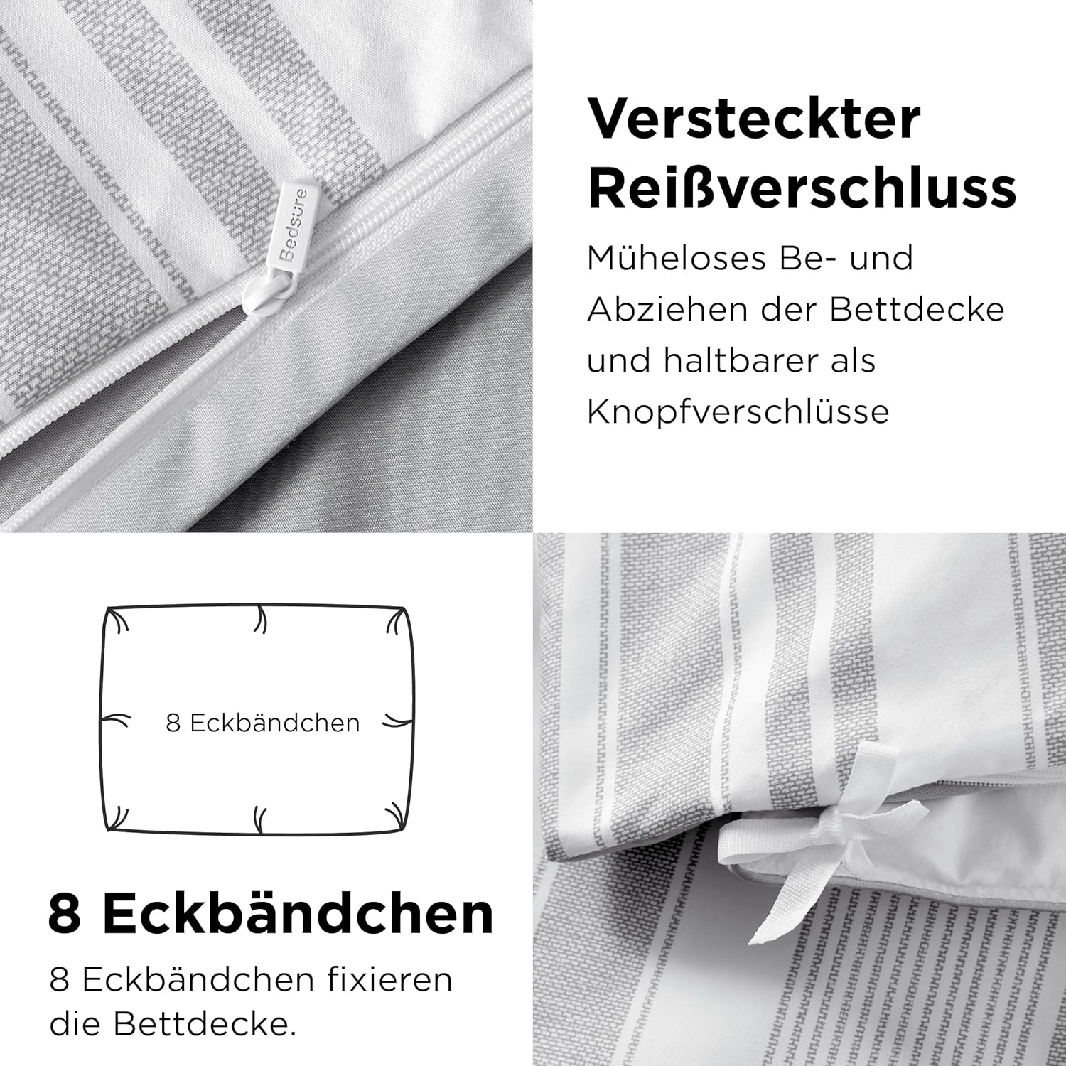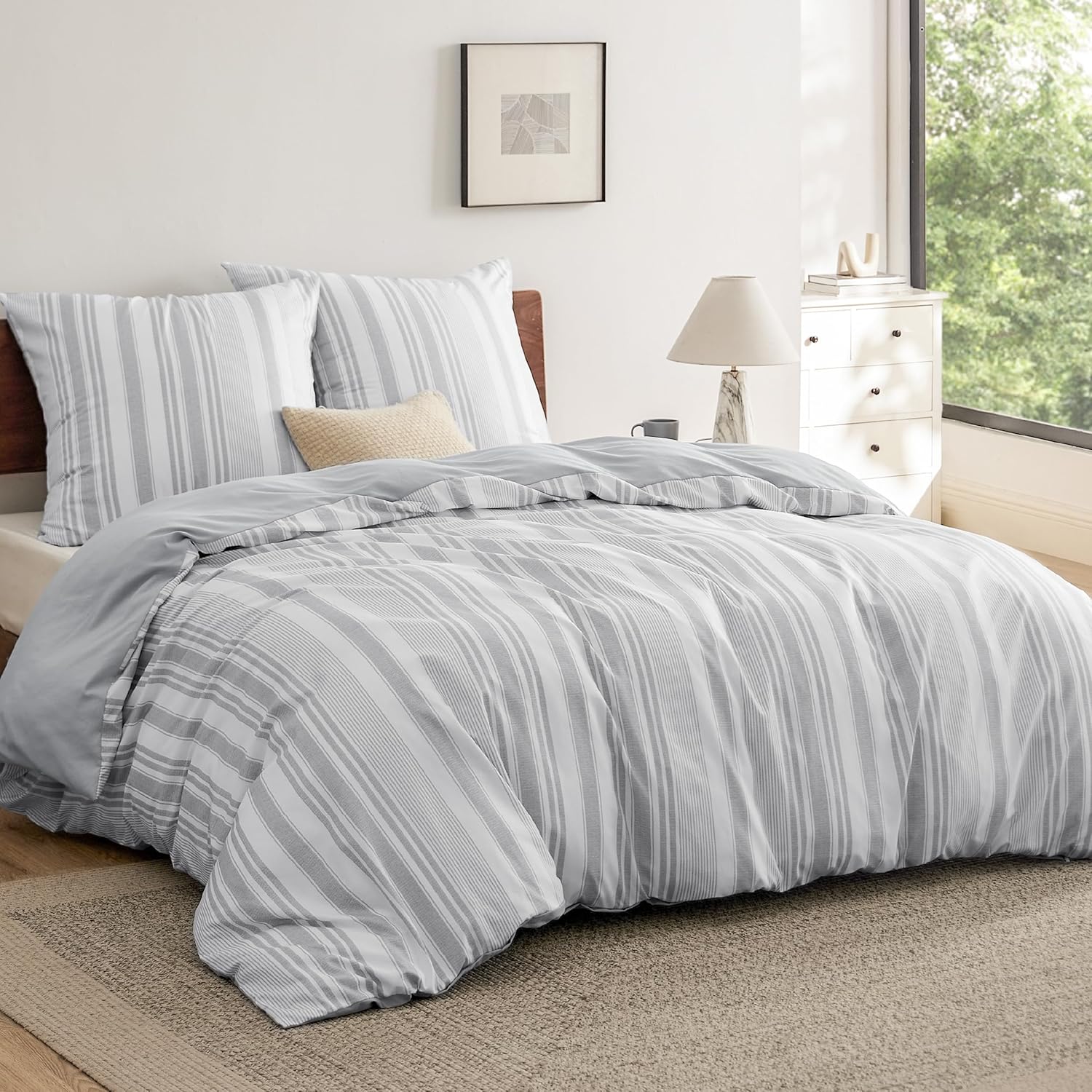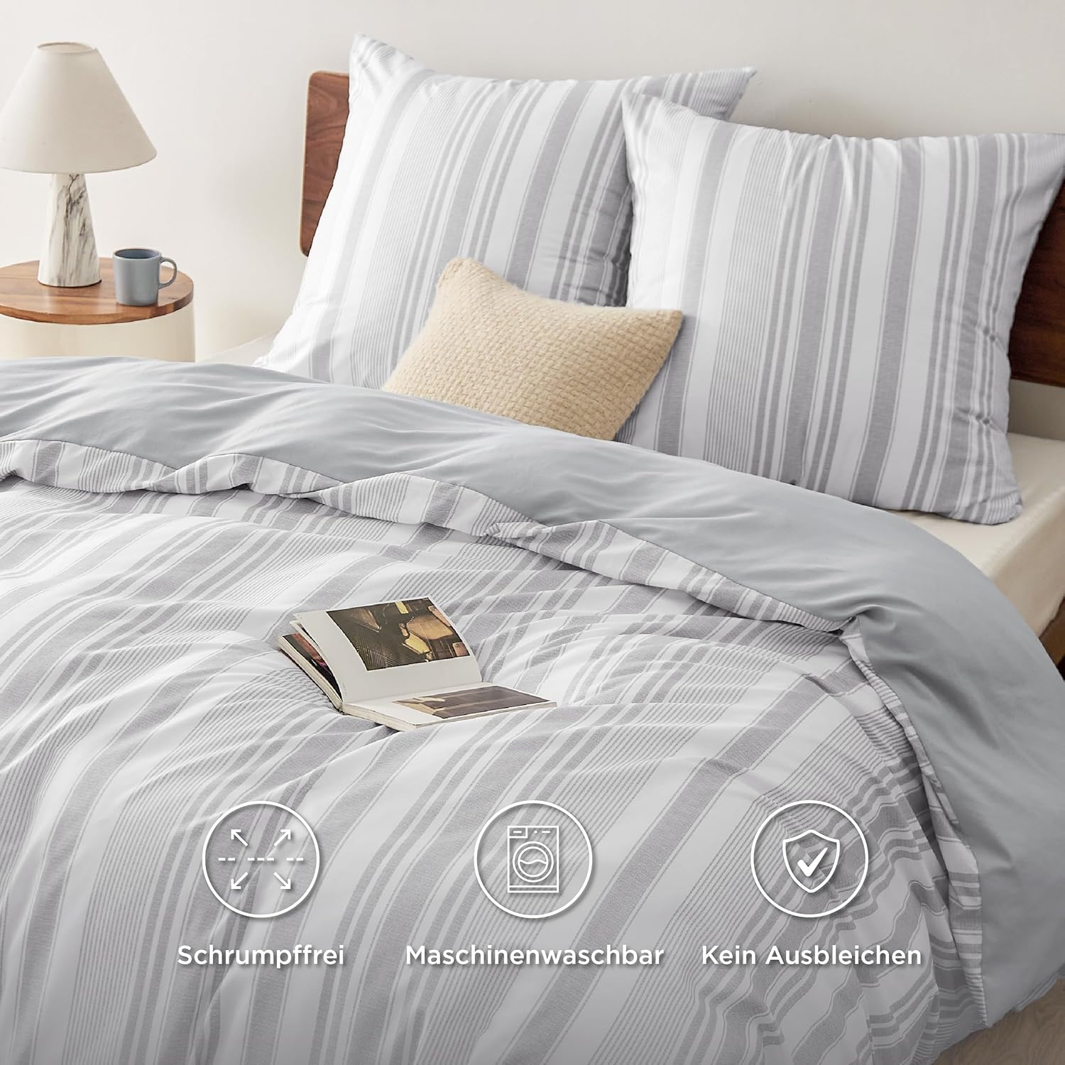Спално бельо BEDSURE 200 x 200 см, 3 части, калъф за завивка - Комплекти спално бельо 200 x 200 см с 2 калъфки за възглавници 80 x 80 см, Oeko-Tex двулицево спално бельо със сиви райета за двойно легло с цип