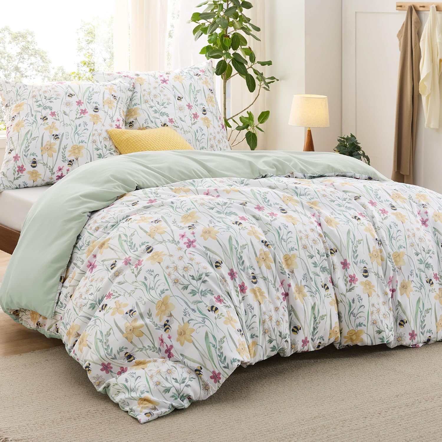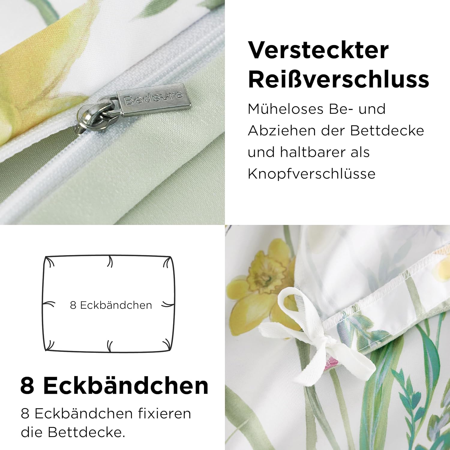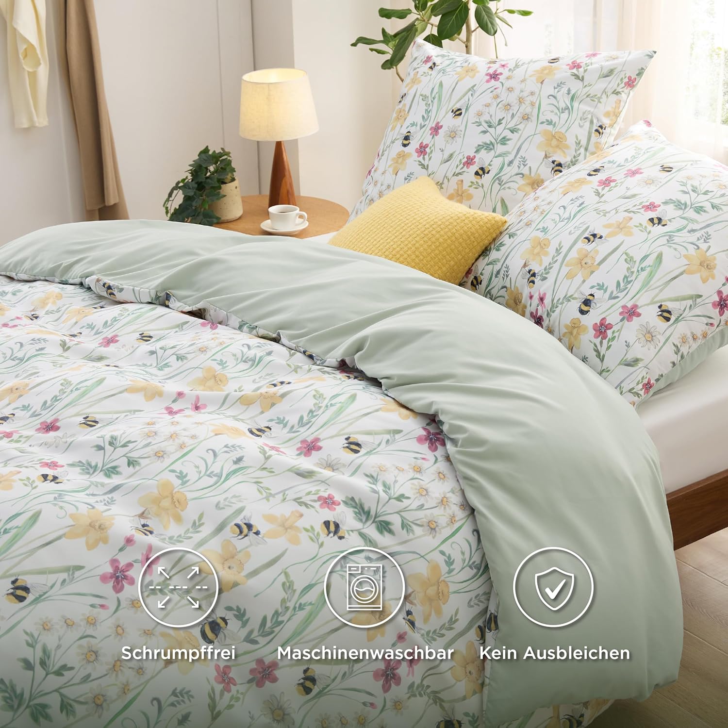 Спално бельо BEDSURE 200 x 200 см калъф за завивка от 3 части - Комплекти спално бельо 200 x 200 см с 2 калъфки за възглавници 80 x 80 см, Oeko-Tex двустранно спално бельо със зелени цветя и растителни мотиви за двойно легло с цип
