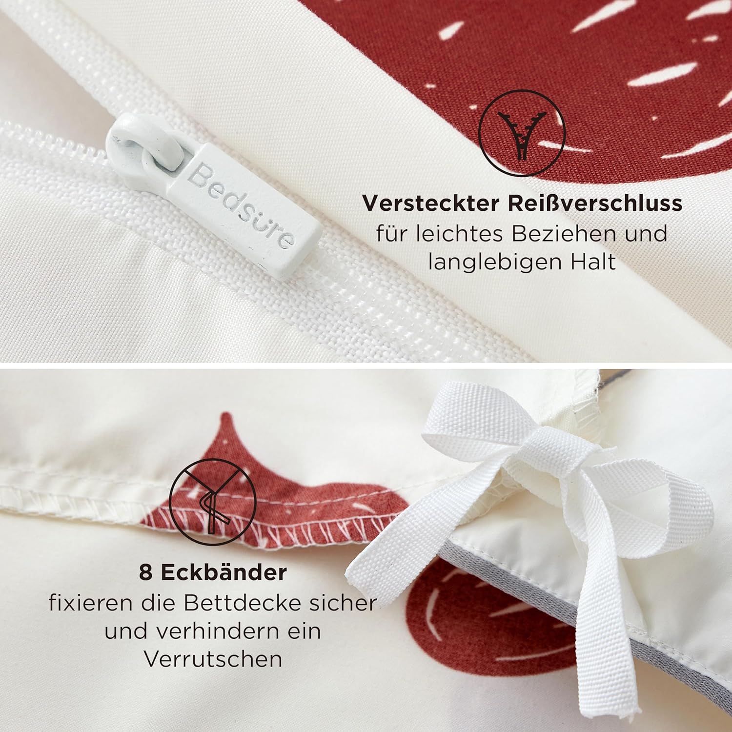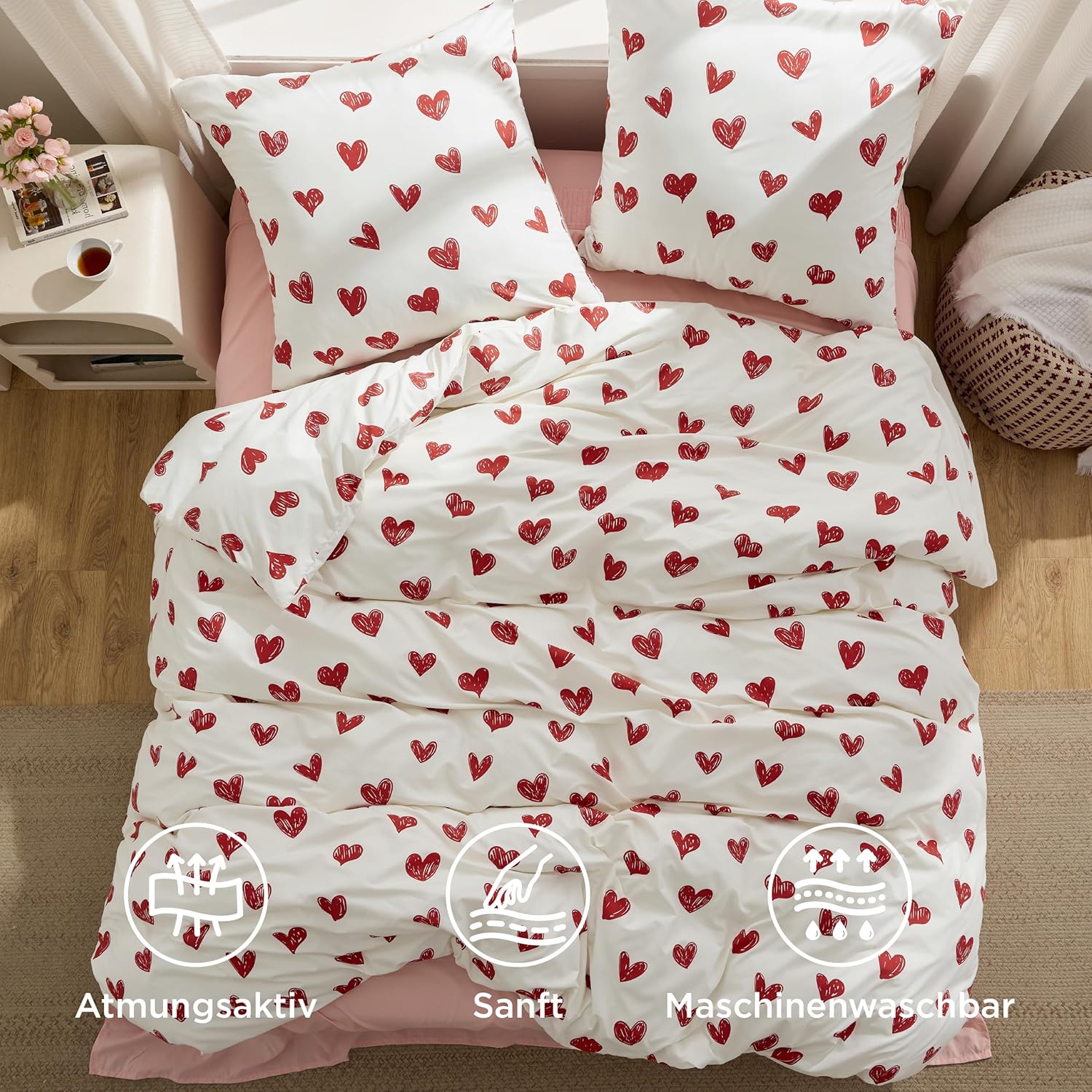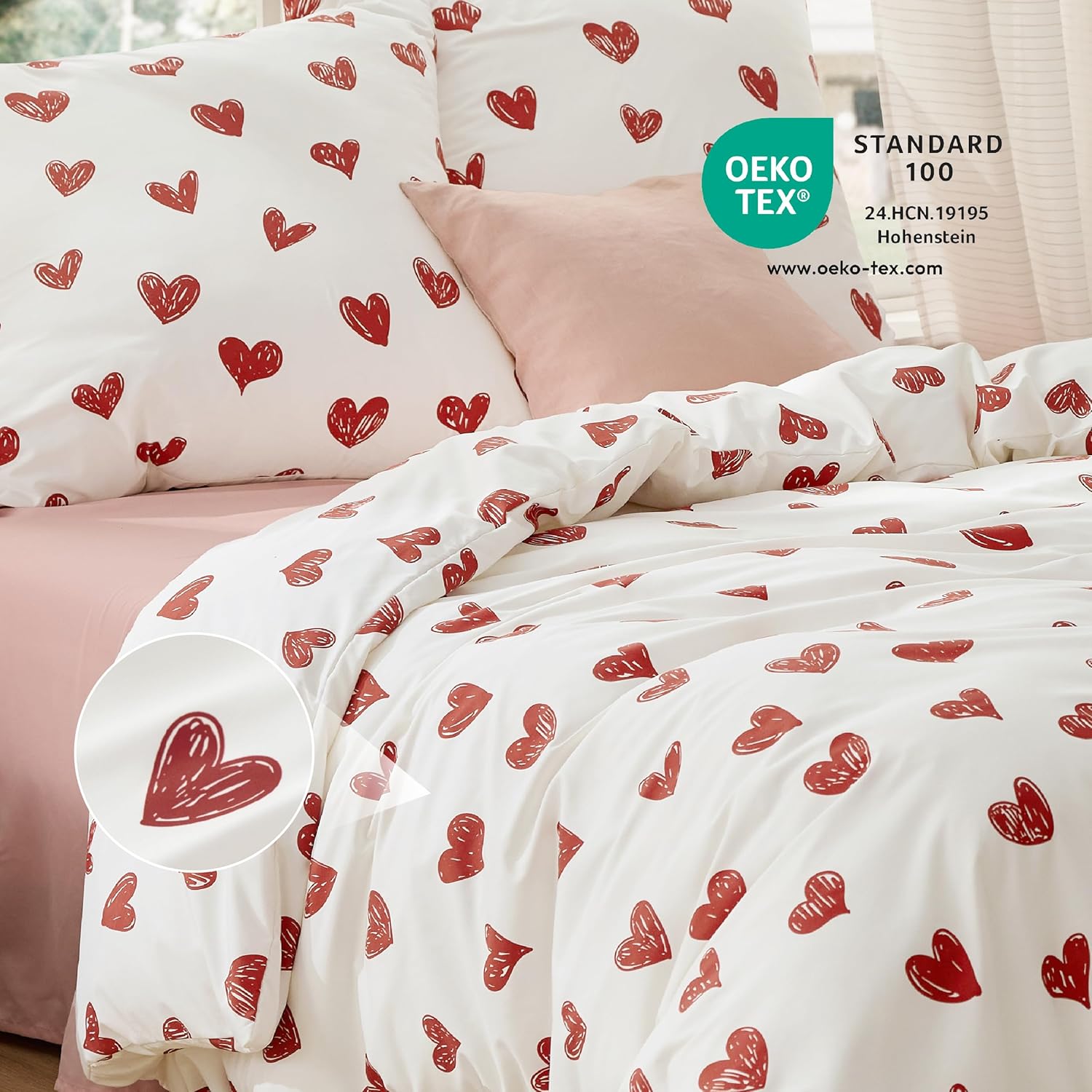 Спално бельо BEDSURE 200 x 200 см Комплект спално бельо от 3 части сърца Плик за завивка с бели сърца 200 x 200 см с 2 калъфки за възглавници 80 x 80 см, Oeko-Tex Спално бельо с мотив червено сърце с цип