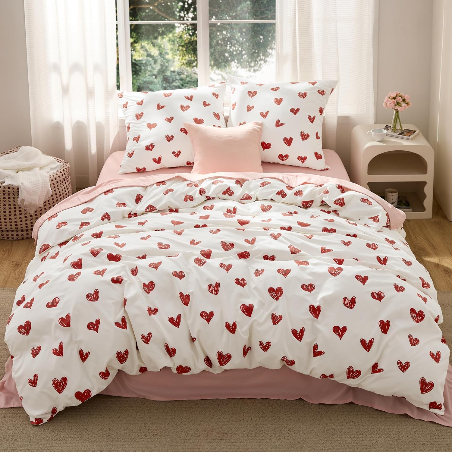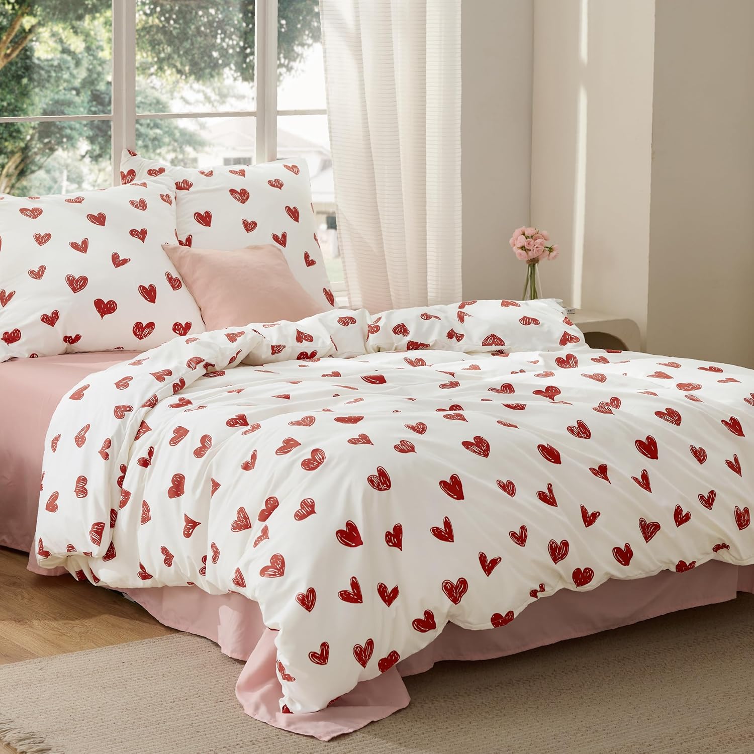 Спално бельо BEDSURE 200 x 220 см Комплект спално бельо от 3 части сърца Бял калъф за завивка 100 x 220 см с 2 калъфки за възглавници 80 x 80 см, Oeko-Tex Спално бельо с мотив червено сърце с цип