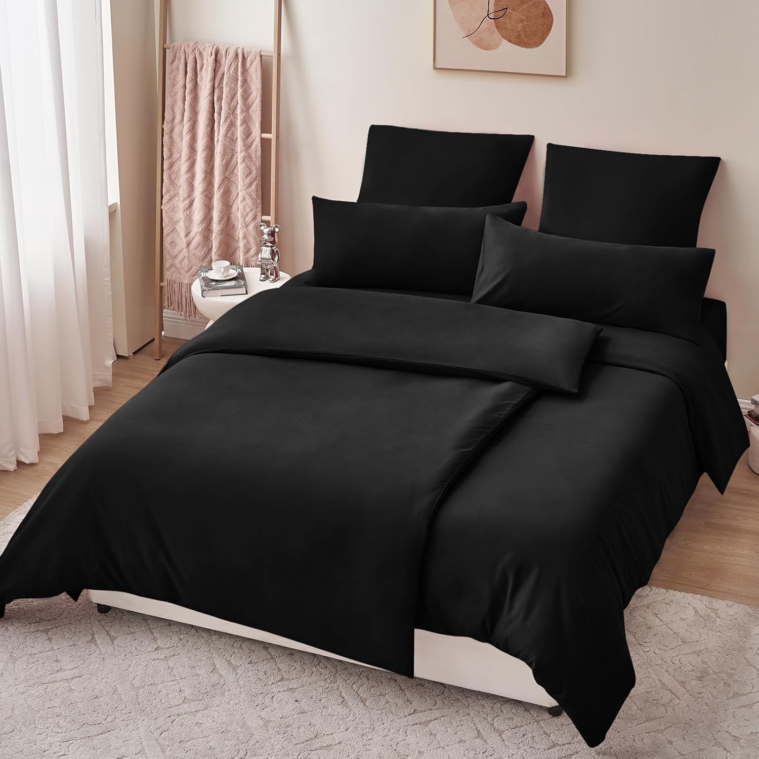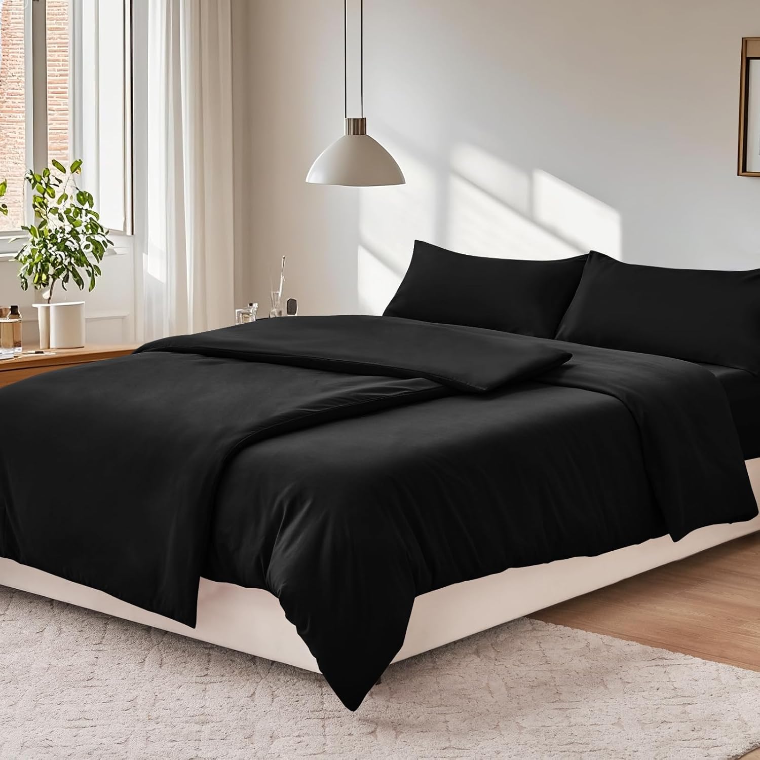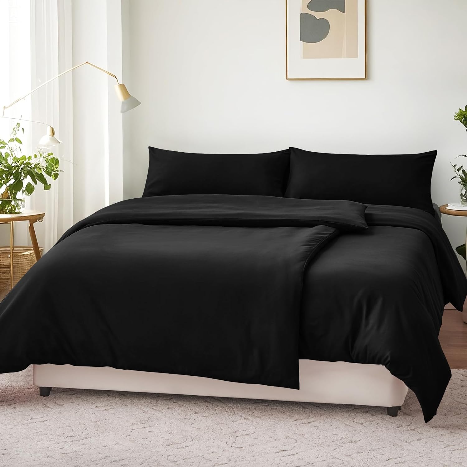 Спално бельо RUIKASI 135 x 200 см, 4 части, черно - Полиестерен микрофибър, Oeko-Tex, 2 калъфа за завивки 135 x 200 см + 2 калъфки за възглавници 40 x 80 см с цип, меко и нежелаещо гладене