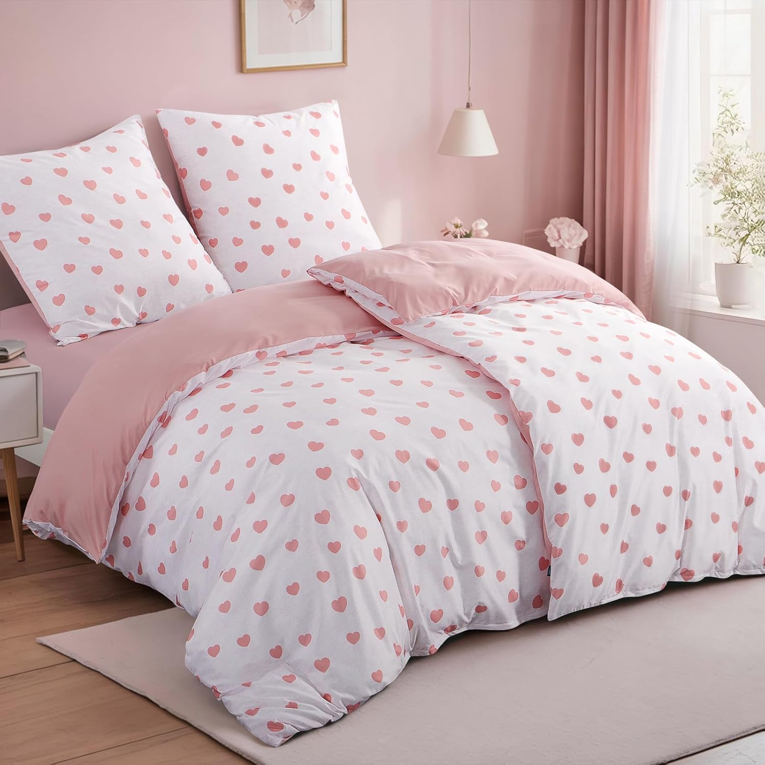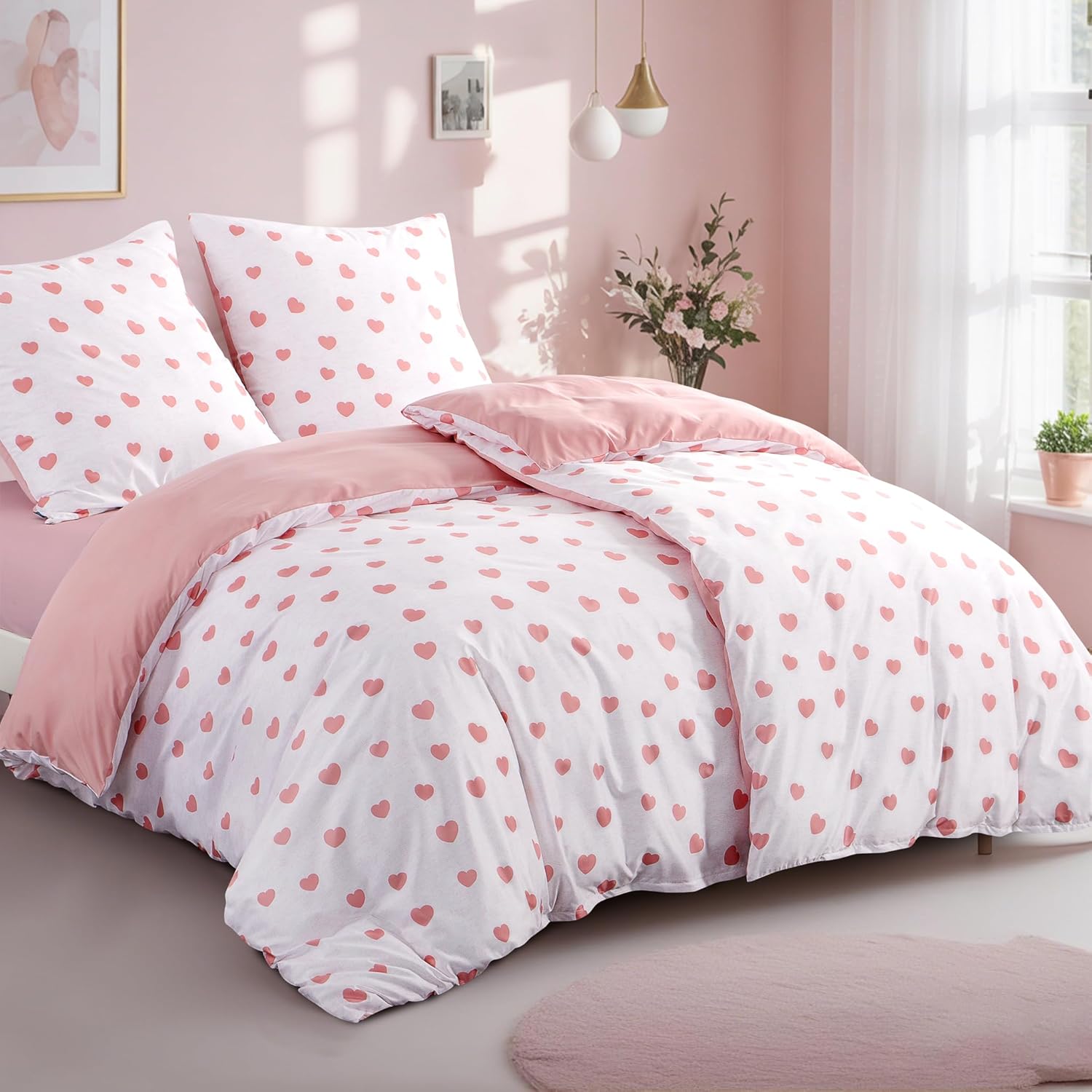 Спално бельо RUIKASI 135 x 200 см, 4 части, със сърца - бяло-розови калъфи за завивки 135 x 200 см, комплект от 2 броя, 135 x 200 см, микрофибърни спални комплекти с цип, меки и не се гладят