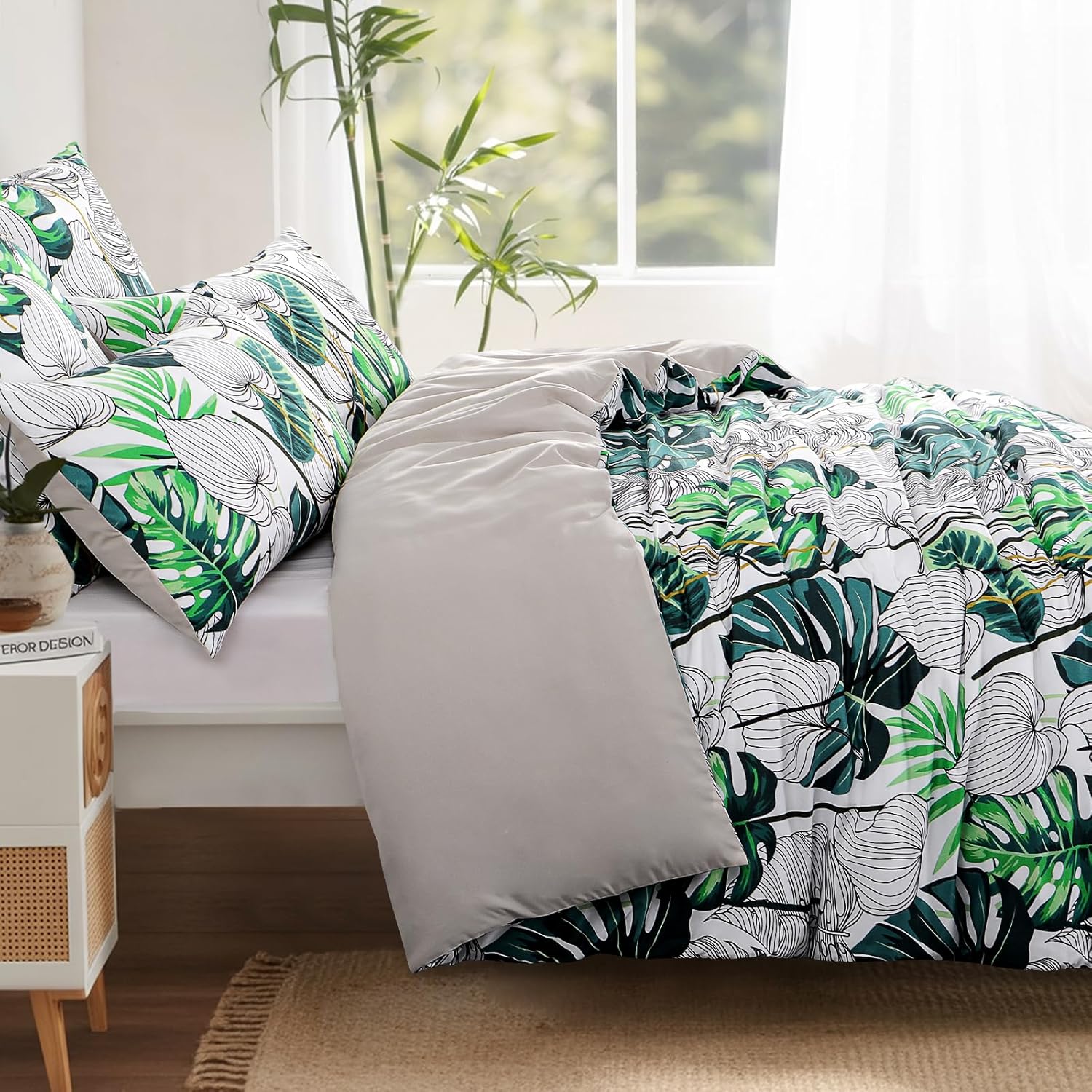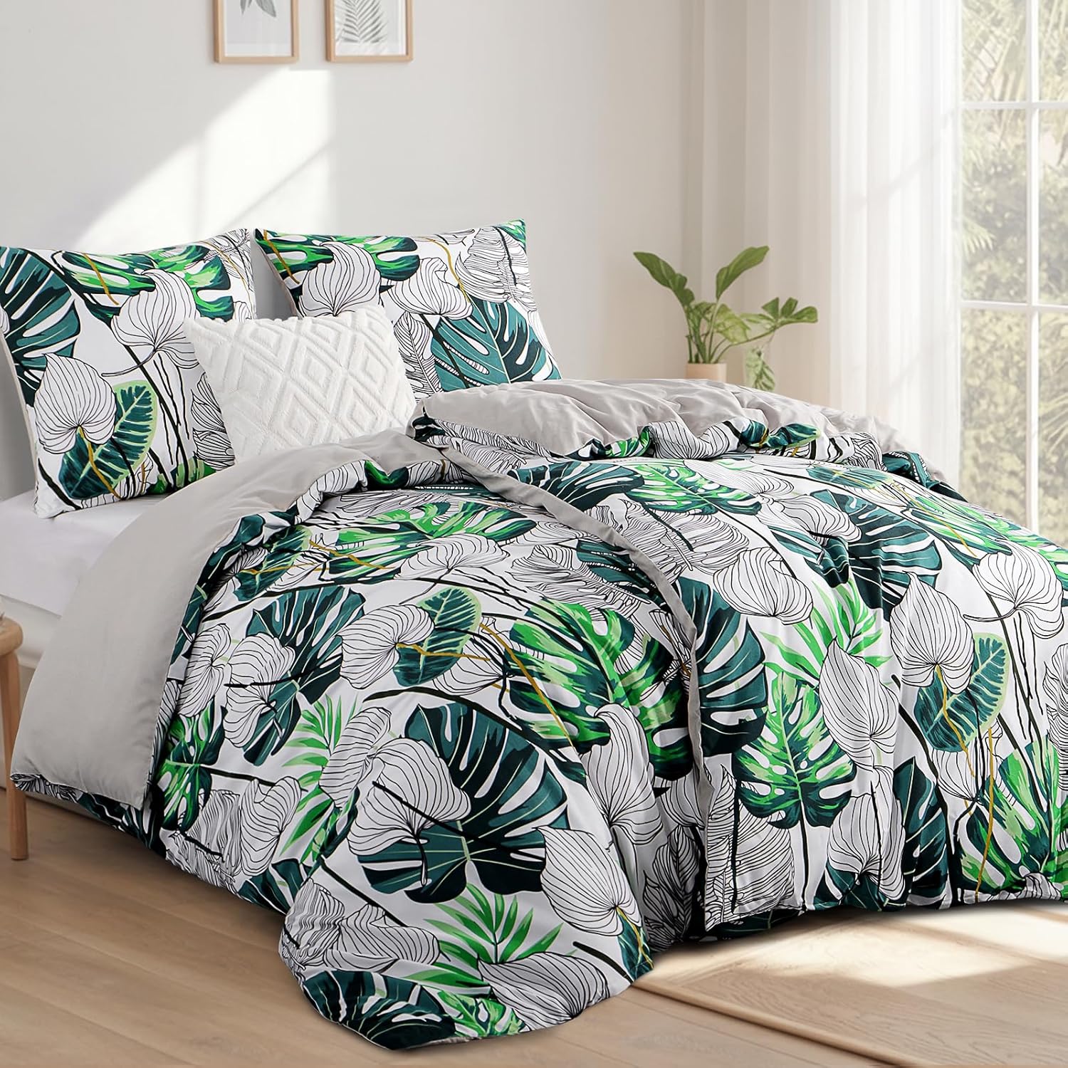 Спално бельо RUIKASI 135 x 200 см Растения, 4 части, зелено, 135 x 200 см, комплект спално бельо от микрофибър Монстера с 2 калъфки за възглавници 80 x 80 см с цип, меко и не се глади