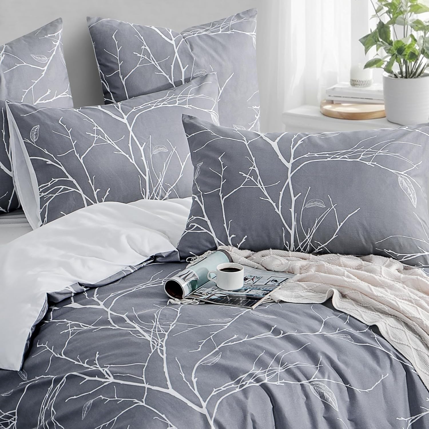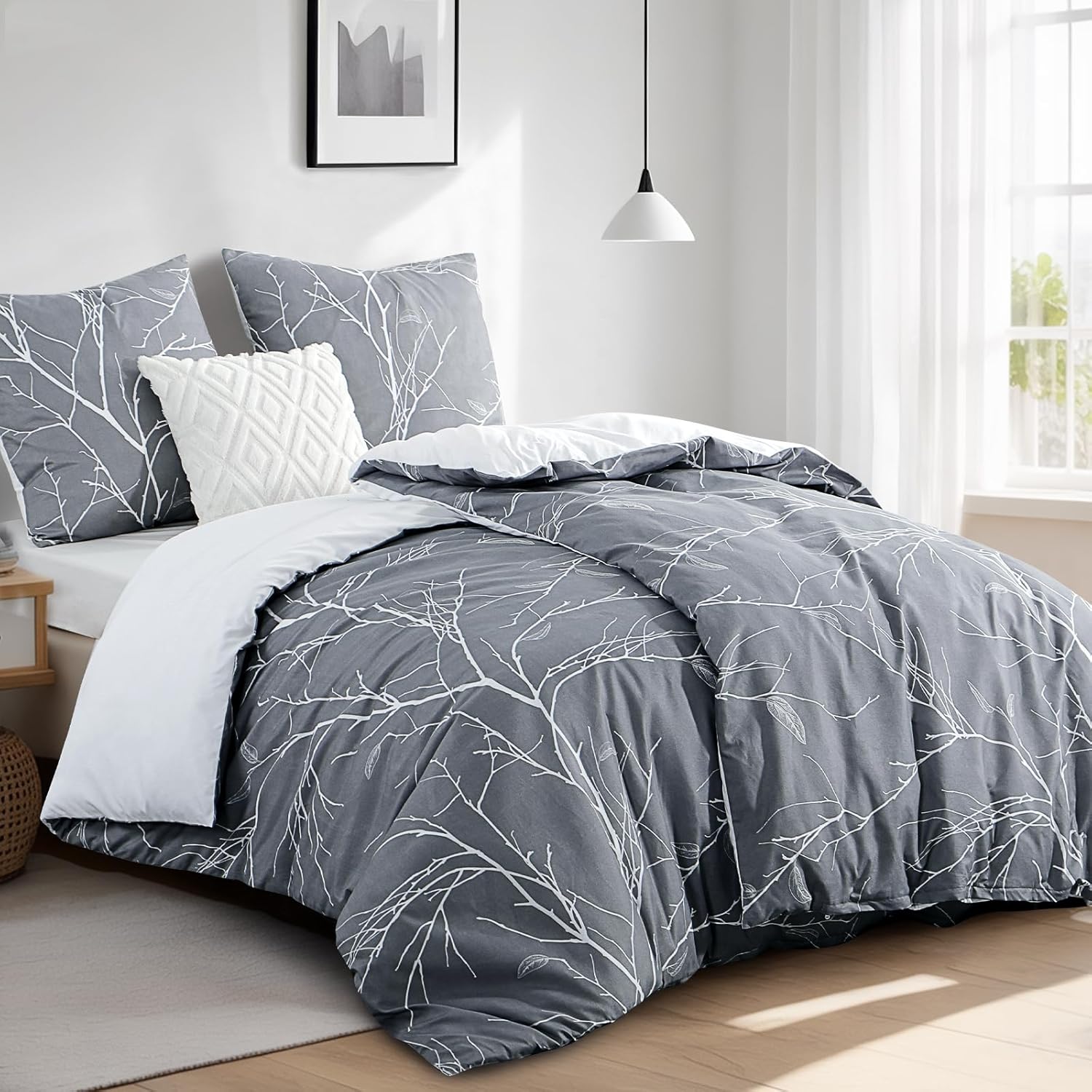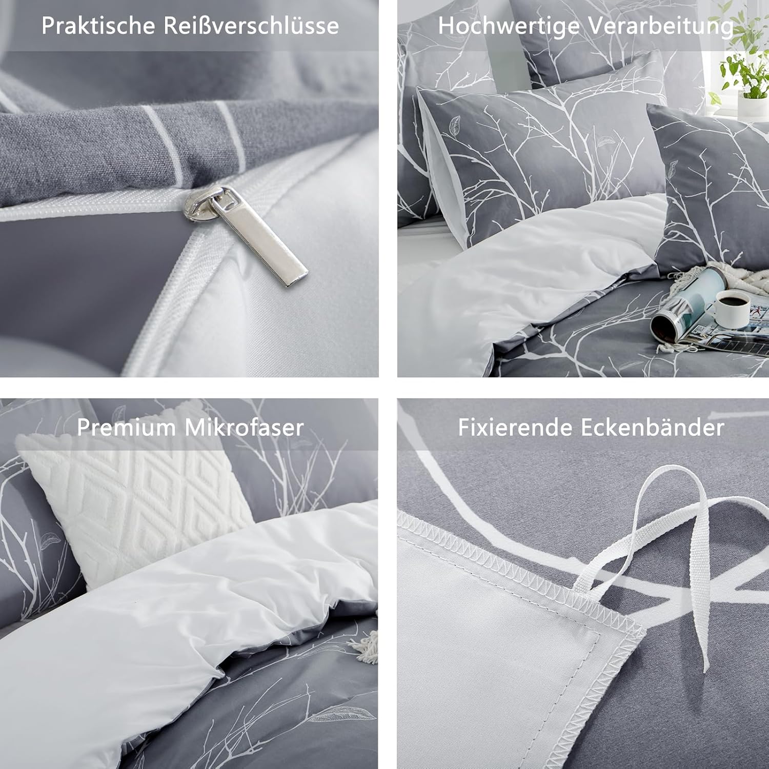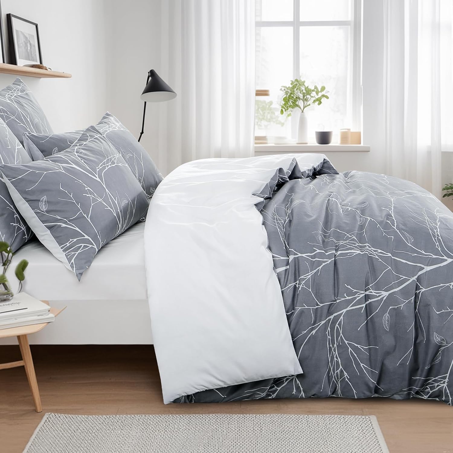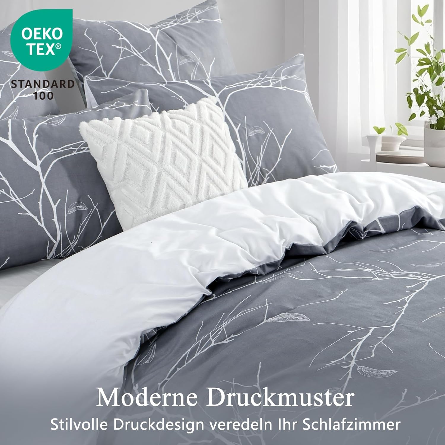 Спално бельо RUIKASI 135 x 200 см с 4 части, сив калъф за завивка Branches 135 x 200 см, комплект спално бельо от микрофибър с 2 калъфки за възглавници 80 x 80 см с цип, меко и не се глади