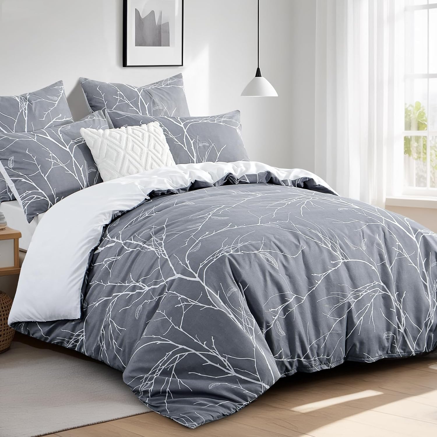 Спално бельо RUIKASI 200 x 220 см Клони Сиво - Плик за завивка от 3 части 220 x 200 см, Комплекти спално бельо от микрофибър с 2 калъфки за възглавници 80 x 80 см с цип, Меко и не се глади