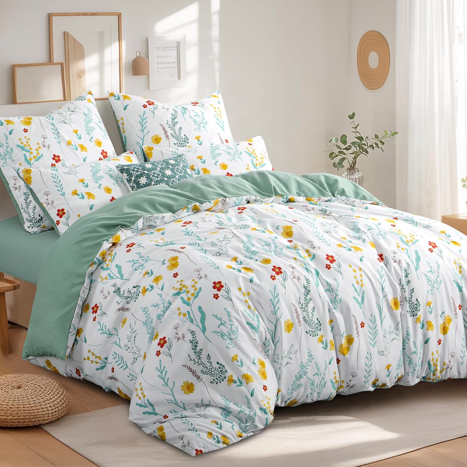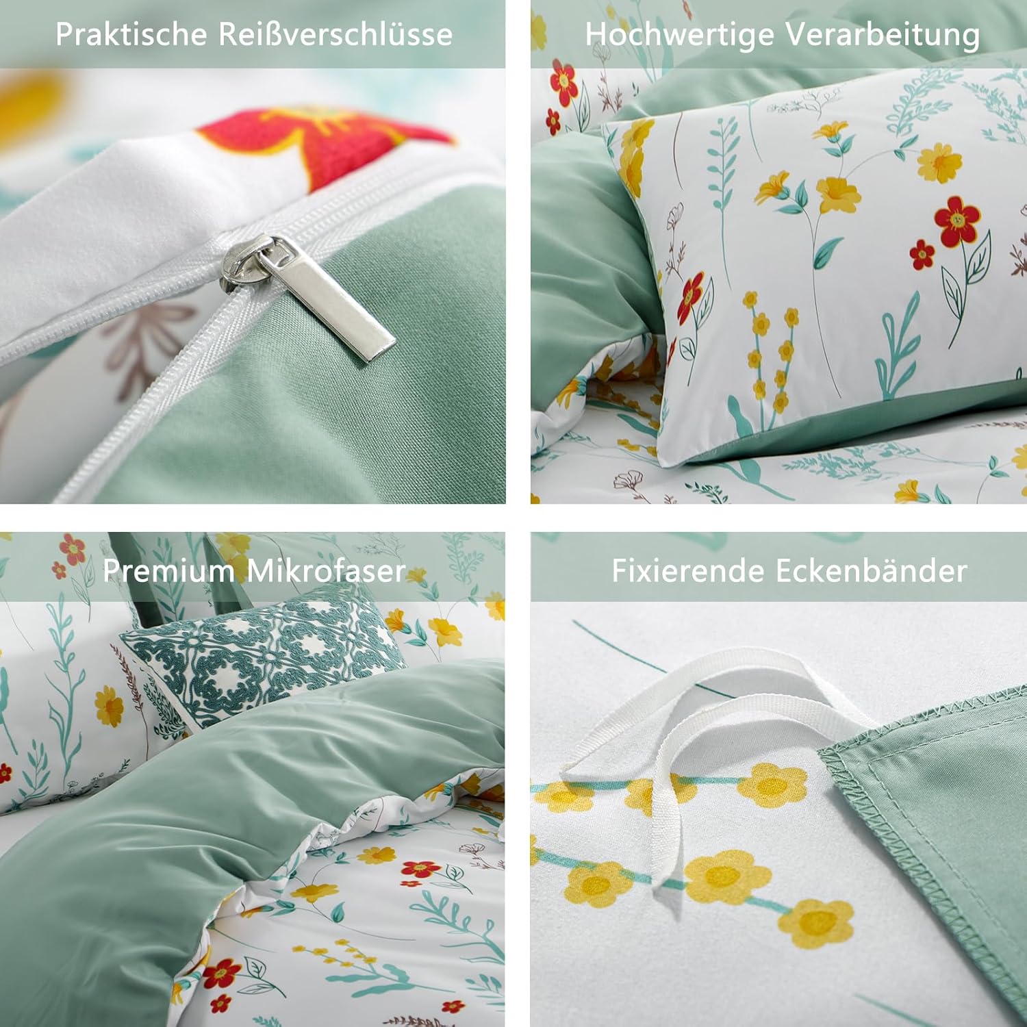 Спално бельо RUIKASI 200 x 220 см Цветя, градински чай, зелено - калъф за завивка от 3 части с флорален мотив 220 x 200 см, комплект спално бельо от микрофибър с флорален мотив и 2 калъфки за възглавници 80 x 80 см с цип, меко и не се глади
