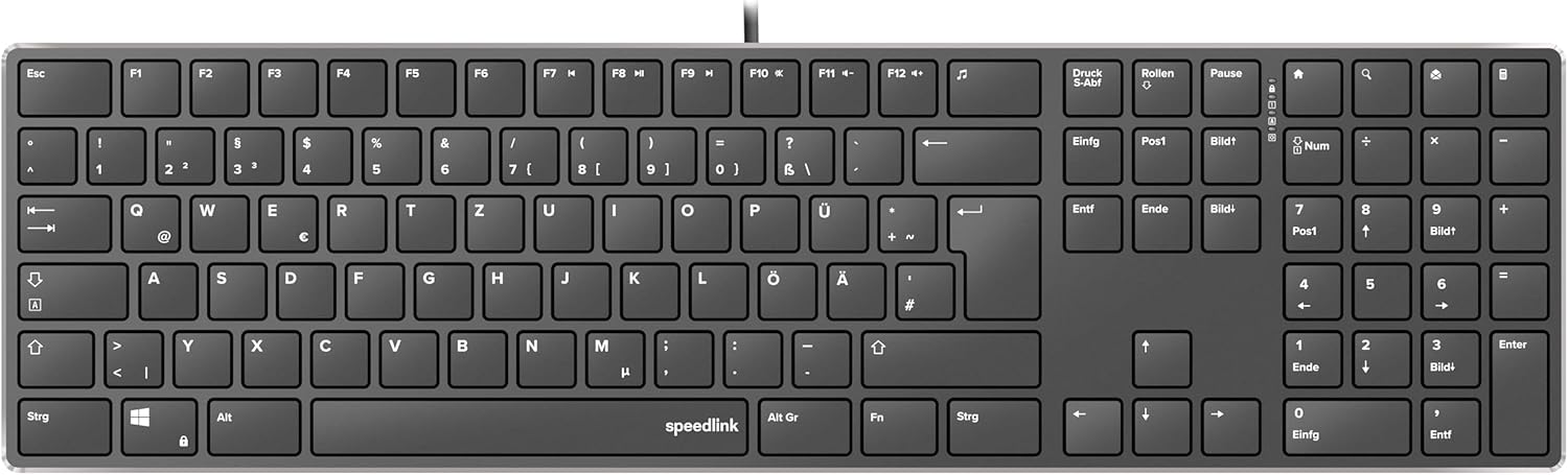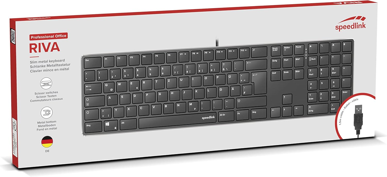Стилната клавиатура RIVA Scissor Keyboard от Speedlink съчетава модерни технологии с елегантен дизайн. Независимо дали работите от вкъщи или в офиса, тази висококачествена USB клавиатура с пълноразмерна клавиатура прави работата особено лесна. Пълноразмерната клавиатура и 7-те многофункционални клавиша позволяват лесно и удобно писане. Усъвършенстваните ножични превключватели осигуряват отлично изживяване при писане, дори при часове писане, и напълно без умора. Друго предимство на ножичните превключватели е приятно плавният и тих ход на клавишите. Здравата метална основа и гумираните крачета на RIVA гарантират, че клавиатурата няма да се плъзга, докато работите. Ножичната клавиатура се свързва чрез 1,5-метров кабел с USB-A конектор. Размери на клавиатурата: 432 x 120 x 19 милиметра (Ш x Д x В), тегло: 548 грама.