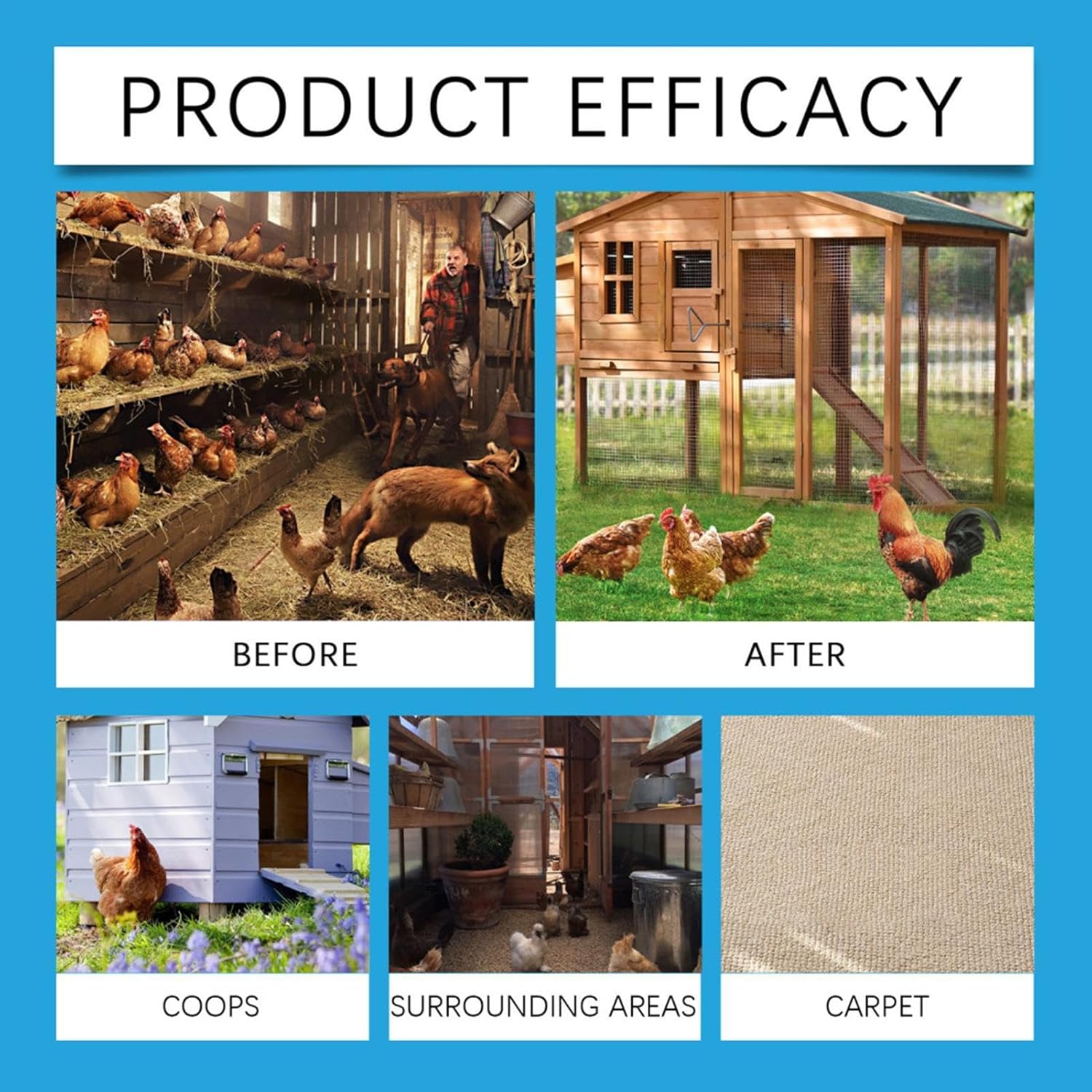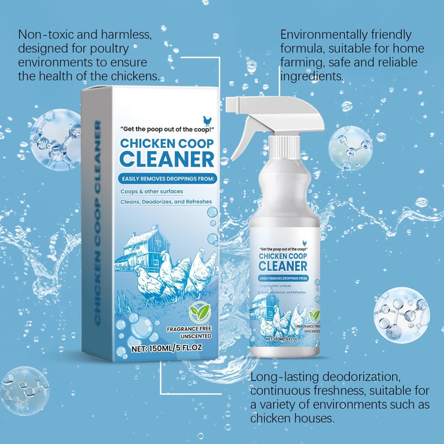 Нашият високоефективен дезодорант използва натурални съставки за извличане и премахване на неприятни миризми. Освен това е преносим и лесен за употреба – просто напръскайте равномерно в целия кокошарник.