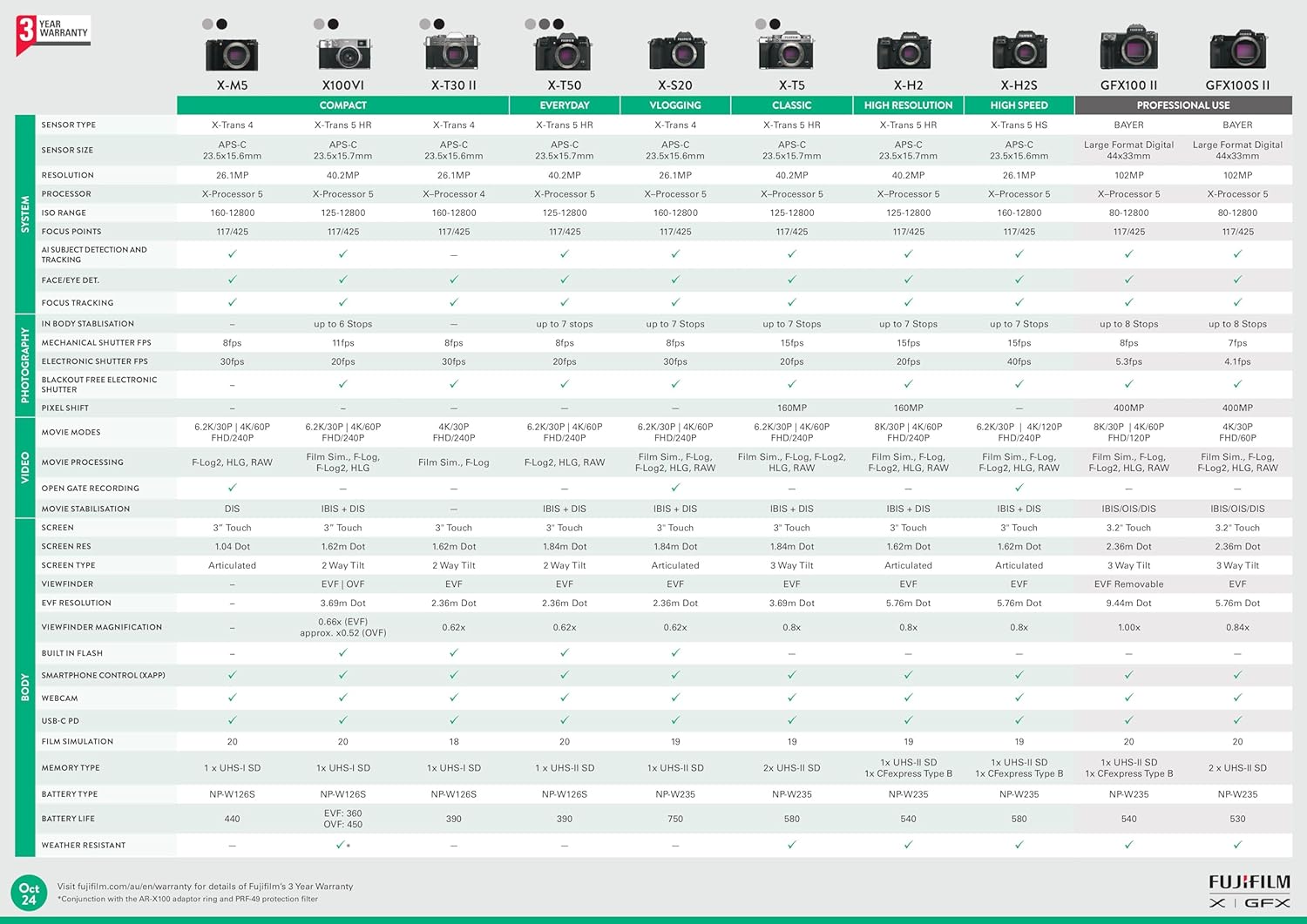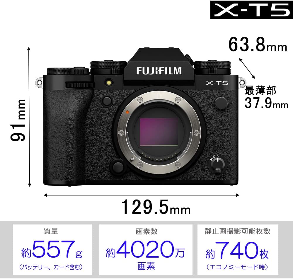 Компактен, лек и с оптимално качество на изображението, FUJIFILM X-T5 предлага на фотографите оптимален цялостен пакет. Той е оборудван с технология за изображения от пето поколение – 40,2-мегапикселов X-Trans CMOS 5 HR сензор с подсветка и бърз X 5 процесор – и предлага вградена петосна стабилизация на изображението с до седем стопа на блендата (EV). Въпреки огромната си производителност, той е по-малък и тежи само 557 г по-малко от предишния модел. X-T5 е перфектният инструмент за взискателните фотографи, които са в движение и не искат да правят компромис с качеството на изображението. Той е едновременно удобен и универсален и е подходящ както за бърза репортажна и улична фотография, така и за висококачествена пейзажна и портретна фотография.