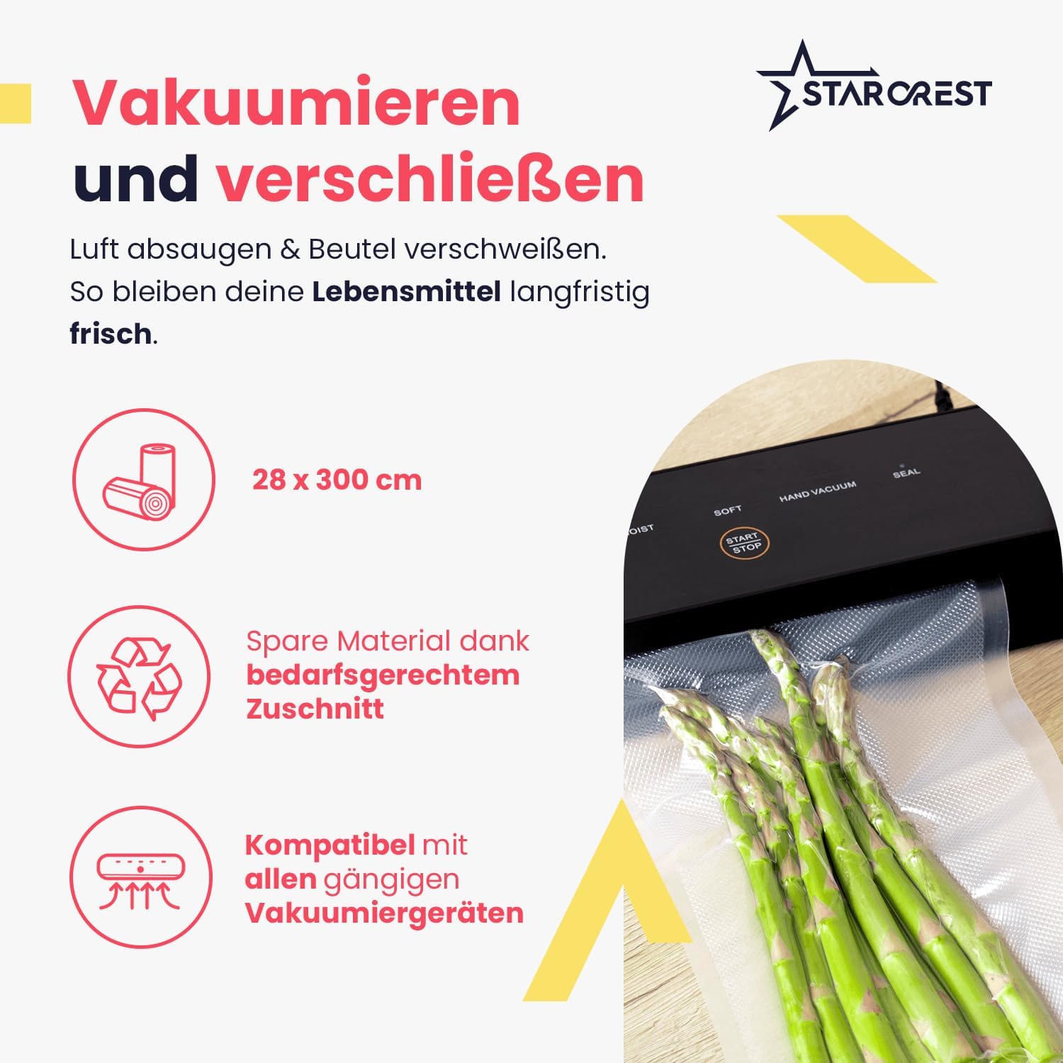• Вакуумиране и запечатване: вакуумният уред от STARCREST изсмуква въздуха от торбичката. След това вакуумната опаковъчна машина затваря торбичката и запазва храната ви свежа и защитена от въздух.