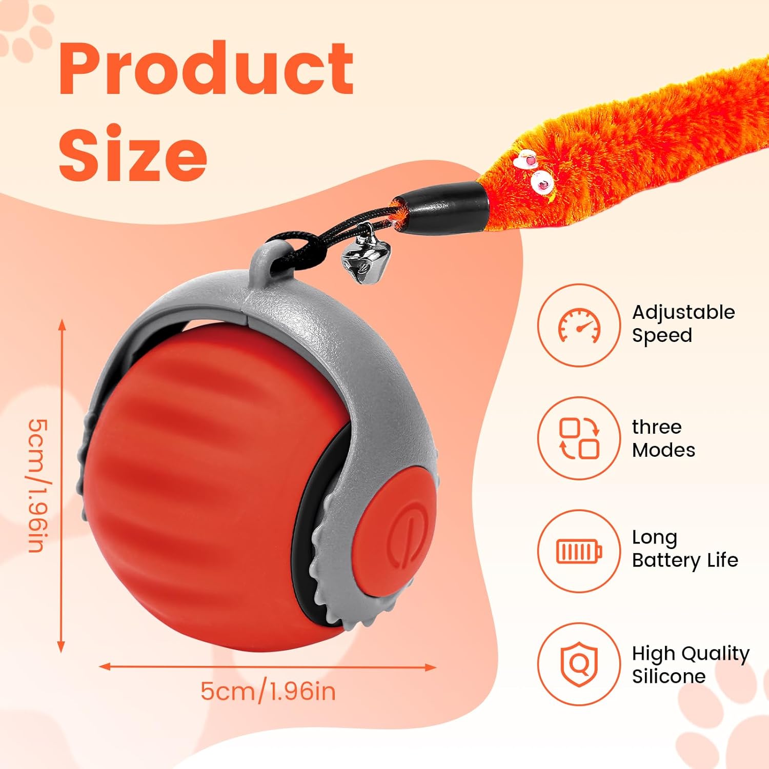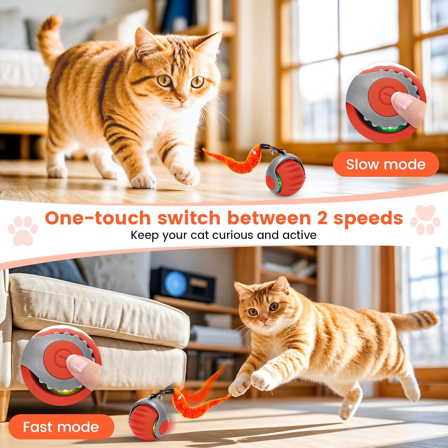 • Регулируеми две скорости: с две опции за скорост, тази играчка-топка за котки може да се регулира според енергийните нужди на вашата котка. Лесно превключвайте между ниска и висока скорост, като натиснете бутона за захранване, което я прави идеална както за любопитни котенца, така и за игриви възрастни котки.