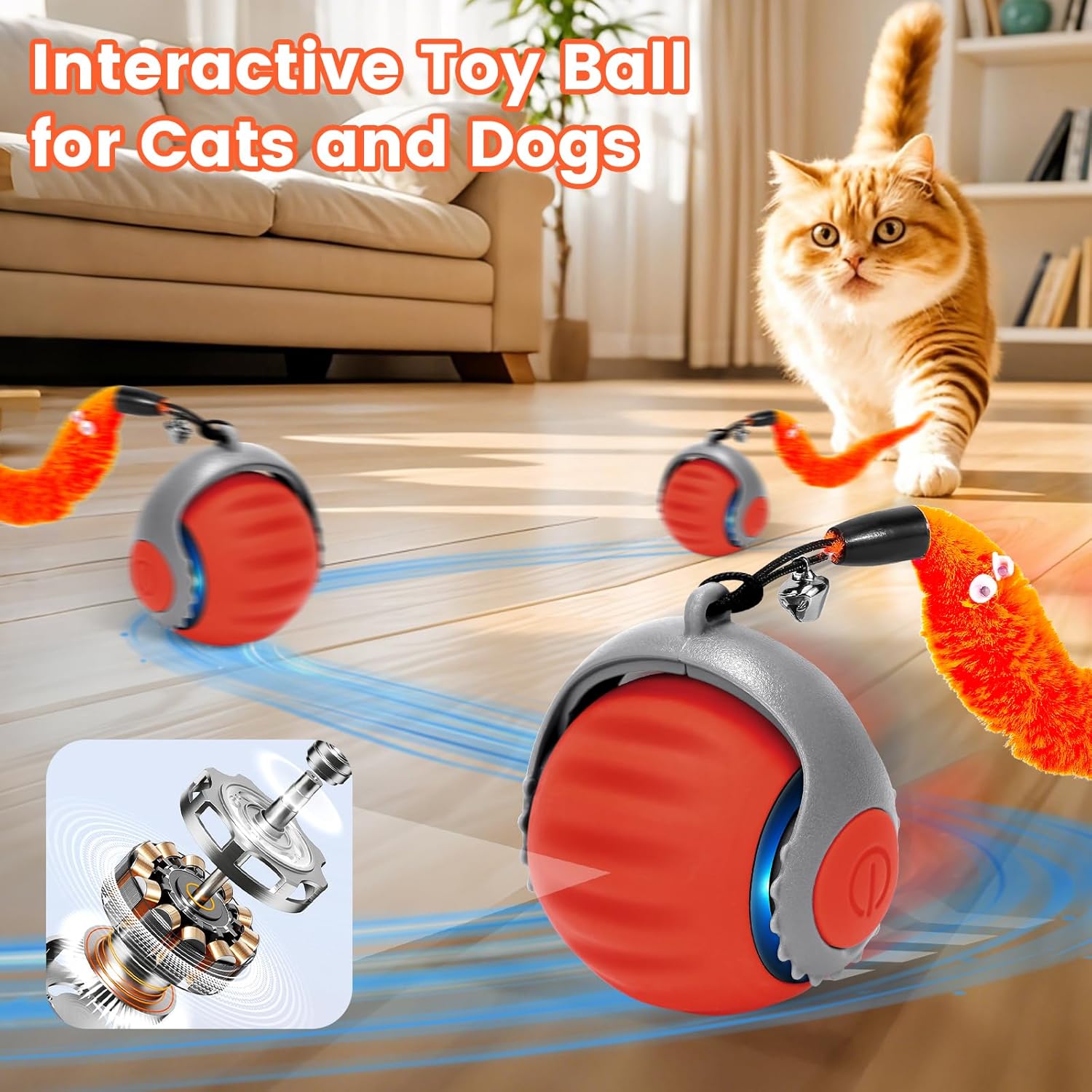 Starnearby 2025 Chase Master Pro Котешка играчка Интерактивна котешка топка Електрическа Speedy Tail 3.0 Powerball Котешка играчка с 3 резервни опашки (оранжева)