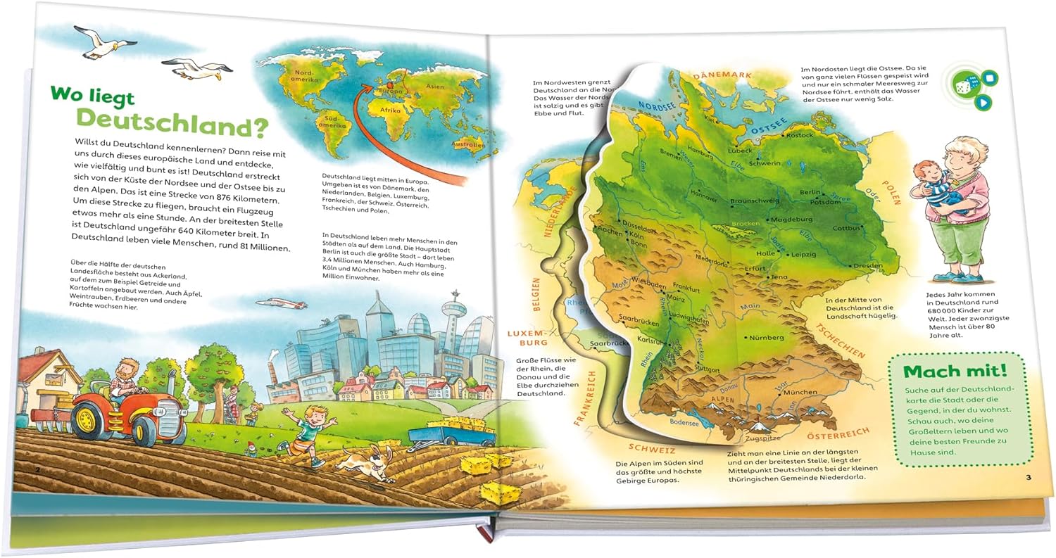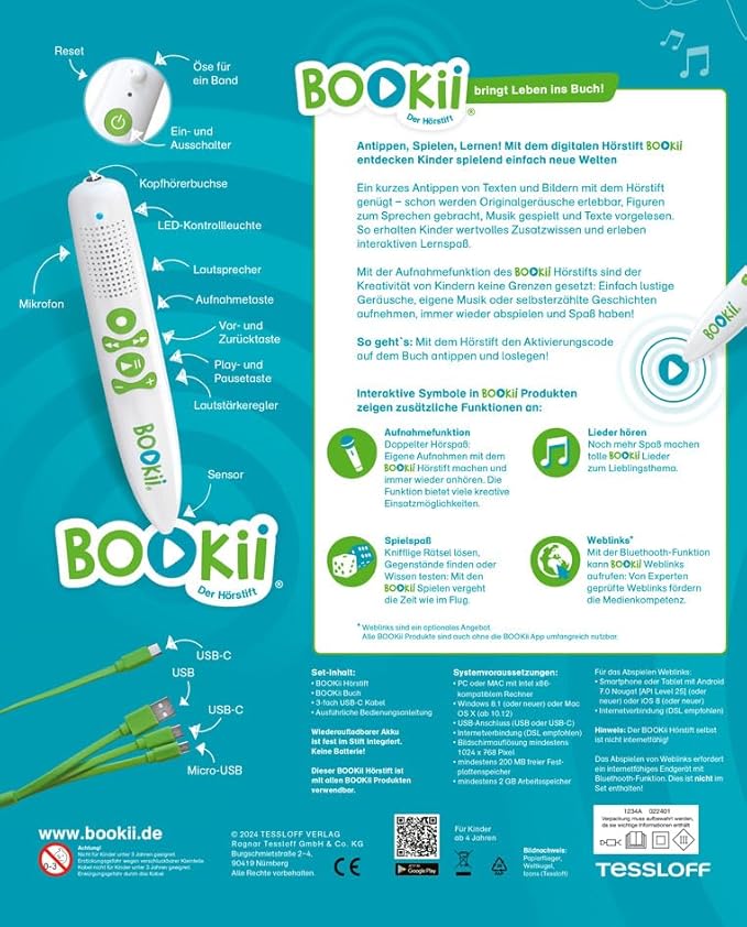 Как звучи камбаната на Кьолнската катедрала? Къде пасат мирните овце Хайдшнукен? И как звучи, когато самолет излита от летище Франкфурт? Децата могат не само да четат или виждат снимки на вълнуващи факти за родината си Германия в тази книга, но и да ги чуват: благодарение на технологията BOOKii®. Просто докоснете аудио химикалката BOOKii® върху текстове, снимки, капаци или областите под капаците и децата ще научат увлекателни неща за забележителности, фестивали, природа и дива природа в Германия. Те също така ще открият как работят демокрацията и законодателството и колко разнообразни могат да бъдат диалектите. С над 900 аудио преживявания и интерактивна игра на всяка двойна страница. Стартовият комплект включва аудио химикалка BOOKii® с екологичен картонен калъф, троен свързващ кабел, инструкции, безплатен лист със стикери за записи и книгата „BOOKii® Discover Germany!“. Вложката в кутията е изработена от екологичен материал. Системни изисквания на BOOKii®: PC или Mac с x86 процесор / Windows 8.1 (или по-нова версия) или / Mac OSX (10.12 или по-нова версия); USB порт (USB или USB-C); Интернет връзка (препоръчва се DSL); Резолюция на екрана поне 1024 x 768 пиксела; Поне 200 MB свободно пространство на твърдия диск; Поне 2 GB RAM; Капацитет за съхранение на BOOKii®: 8 GB; Вградена литиево-йонна батерия: 3.7 V, 350 mAh; Порт за пренос на данни: USB-C; Bluetooth: Версия 4.0; 2400–2483.5 MHz ISM честота, максимален обхват приблизително 10 метра; Забележка: Самата писалка за слух не е свързана с интернет! Температура на околната среда: от 5 до 40°C; Общи размери (Д x Ш x В): 155 x 25 x 20 мм. Още въпроси? На https://www.bookii.de ще намерите помощ за писалката и програмата BOOKii®, както и информация за редовни актуализации на софтуера и гаранция. ADR продукт | Директива на ЕС за безопасност на детските играчки: с лого CE | Внимание! Не е подходящ за деца под 3 години. При разкъсване могат да се образуват малки части. Опасност от задавяне! Кабелът не е подходящ за деца под 3 години. Опасност от задушаване!