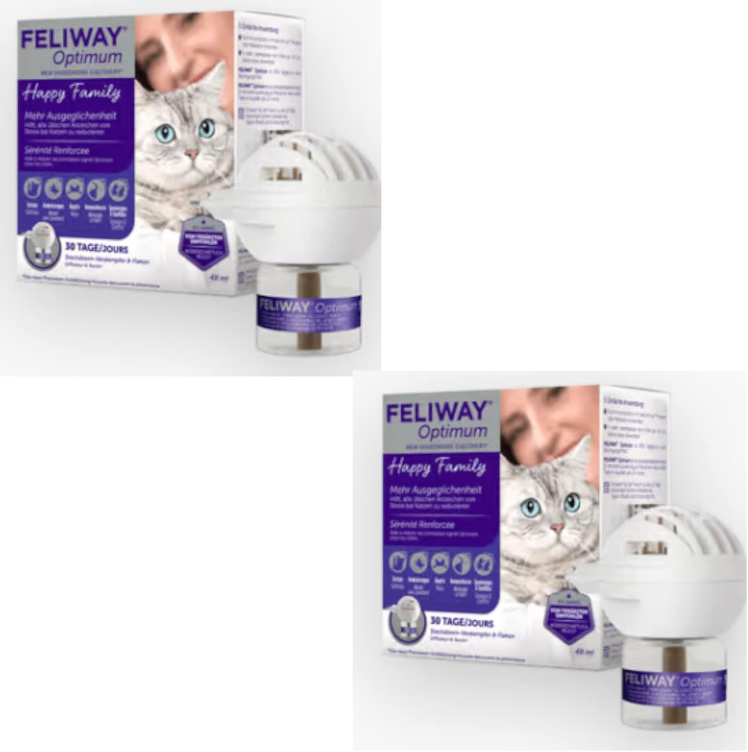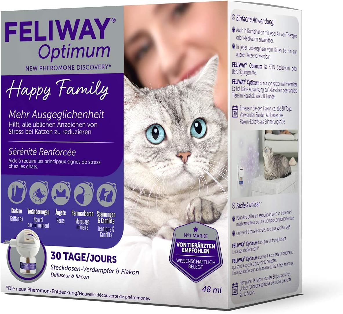 Auch wenn Sie als Katzenhalter das Beste für Ihr Tier wollen, birgt der moderne hektische Alltag für Mensch und Tier einige Herausforderungen. FELIWAY Optimum wurde entwickelt, um Sie und Ihre Katzen im Alltag zu unterstützen. Es enthält die fortschrittlichste und effektivste Komposition von Katzen-Pheromon-Bestandteilen, die von dem FELIWAY Forschungsteam entwickelt wurde. Diese neue Entdeckung vermittelt Entspannungsbotschaften, die Ihren Katzen dabei helfen können, sich zuhause wohlzufühlen und Harmonie zwischen Ihren Katzen wiederherzustellen. Kann FELIWAY Optimum meiner Katze helfen? Das Zusammenleben mit Menschen kann für Katzen eine Herausforderung sein. Der hektische Alltag, Veränderungen in unserer täglichen Routine, aber auch dem Umfeld können Katzen stressen. Schaffen Sie mit den Entspannungsbotschaften in FELIWAY Optimum dauerhaft eine Wohlfühlatmosphäre für Ihre Katze. FELIWAY Optimum kann Ihrer Katze dabei helfen: - wenn sie Anzeichen von Unwohlsein oder Stress zeigt, wie z.B. Harnmarkieren, Kratzen an Wänden und Möbeln oder Verstecken, wenn sie über weniger Aktivität, reduziertem Appetit oder Kahllecken zeigt, dass sie aktuell gestresst ist, wenn Veränderungen in Ihrer Wohnung anstehen (z.B. Umzug, Renovierung, neue Möbel, Ankunft eines neuen Haustiers, Ankunft eines neuen Familienmitglieds), wenn es zwischen zusammenlebenden Katzen Anzeichen von Spannung gibt, wie Jagen, Blockieren, Anstarren oder Kämpfen; auch wenn diese schon seit längerer Zeit bestehen. Verwenden Sie FELIWAY Optimum zudem, um Ihre neue Katze in Ihrem Zuhause einzugewöhnen oder um zwei oder mehrere Katzen aneinander zu gewöhnen. Die Dauer der Anwendung hängt vom Einsatzgebiet, für das Sie FELIWAY einsetzen wollen, ab. Als Mindestanwendungsdauer wird für die meisten Situationen 30 Tage empfohlen. Bei einigen Einsatzgebieten, wie z.B. bei Konflikten zwischen zusammenlebenden Katzen, Harnmarkieren oder auch Kratzen, wird eine Anwendung von mind. 2-3 Monaten empfohlen.