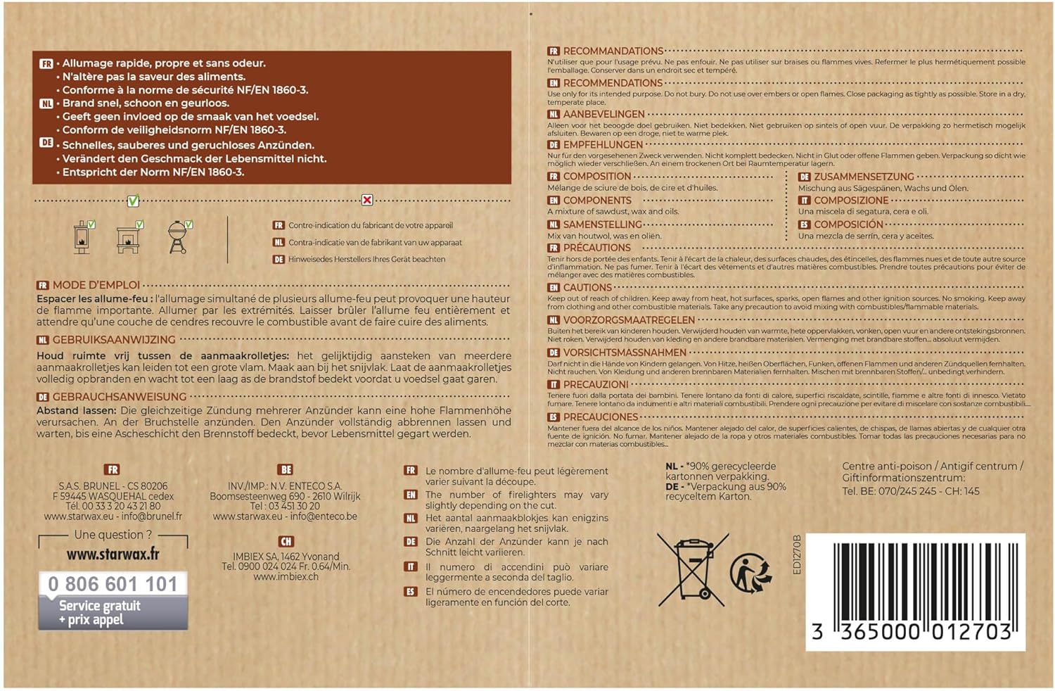 • Натурален състав, направен от внимателно дозирана смес от дървени стърготини и масло. Тези кубчета за запалване отговарят на стандарта за безопасност NF/EN 1860-3. Това гарантира безопасна и надеждна употреба.
