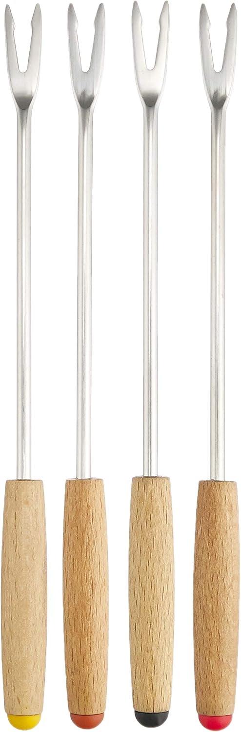 Комплект от 4 къси вилици за малки и мини фондюта. 6 цветни пластмасови накрайника в цветовете на кокот.