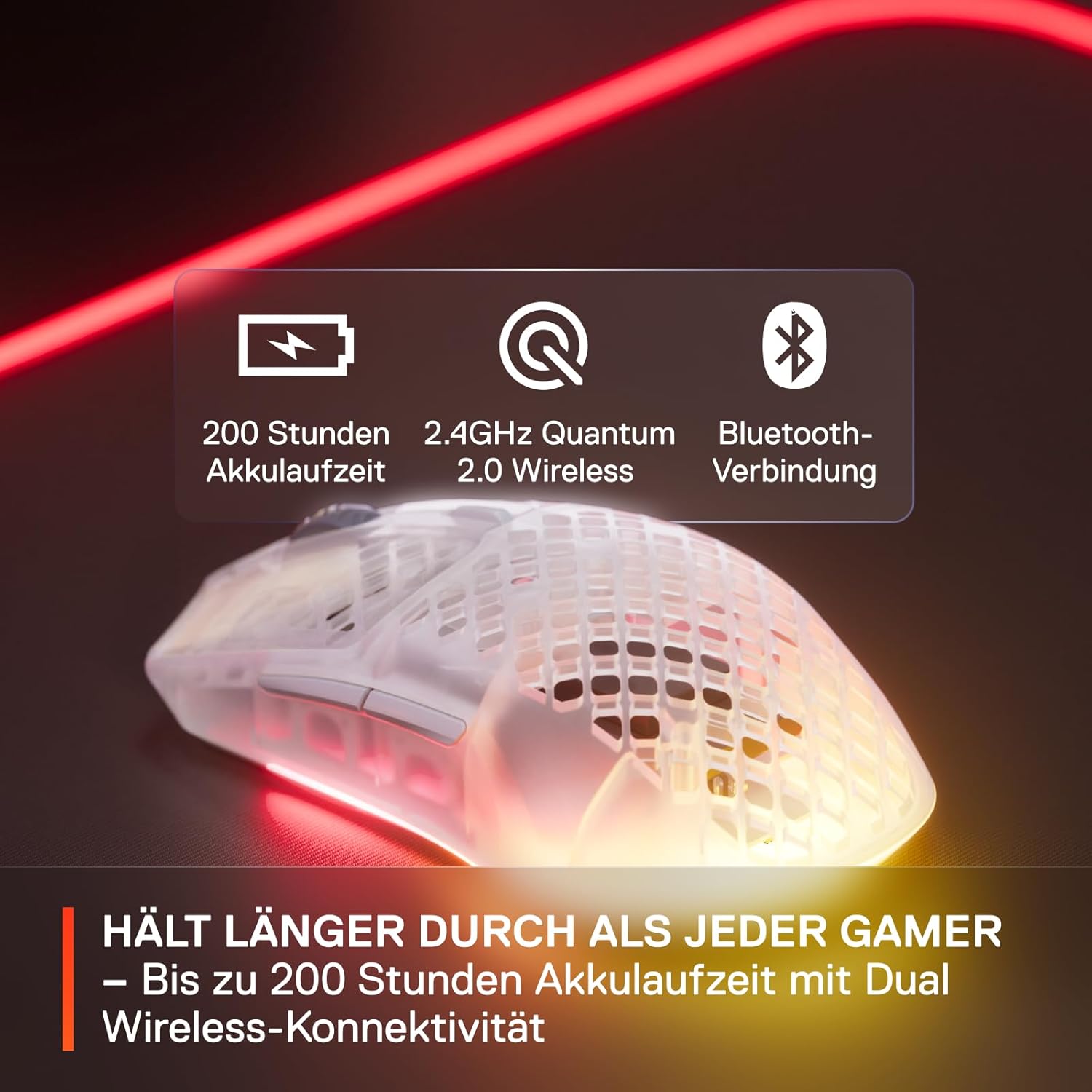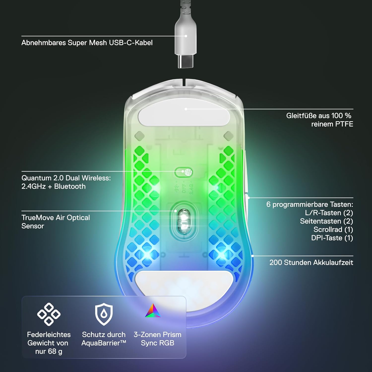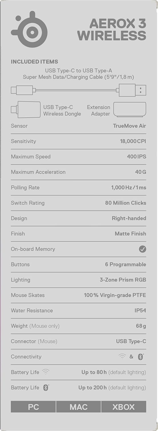Lieferumfang | Aerox 3 Wireless Gaming-Maus, USB-C Wireless-Dongle, USB-Extender, USB-C zu USB-A Super Mesh-Daten-/Ladekabel, Installationshandbuch |