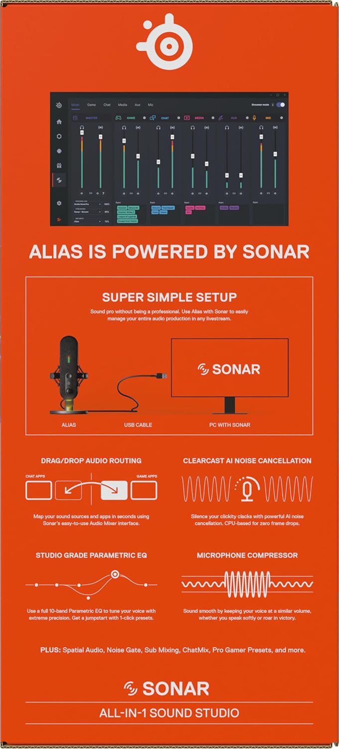 SteelSeries Alias ​​​​USB микрофон за компютър - 3 пъти по-голяма капсула за игри, стрийминг и подкасти - шумопотискане с изкуствен интелект - LED бутон за изключване на звука + монитор за ниво - амортисьор