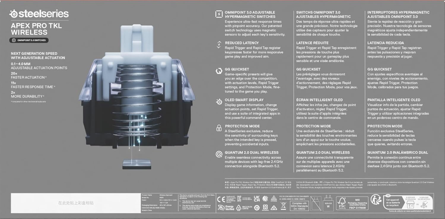 SteelSeries Apex Pro TKL Wireless Gen 3 - Хипермагнитна геймърска клавиатура - OmniPoint 3.0 превключватели - Регулируема реакция - Моментални пресети - Бързо докосване/SOCD - OLED - UK QWERTY оформление