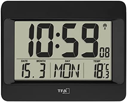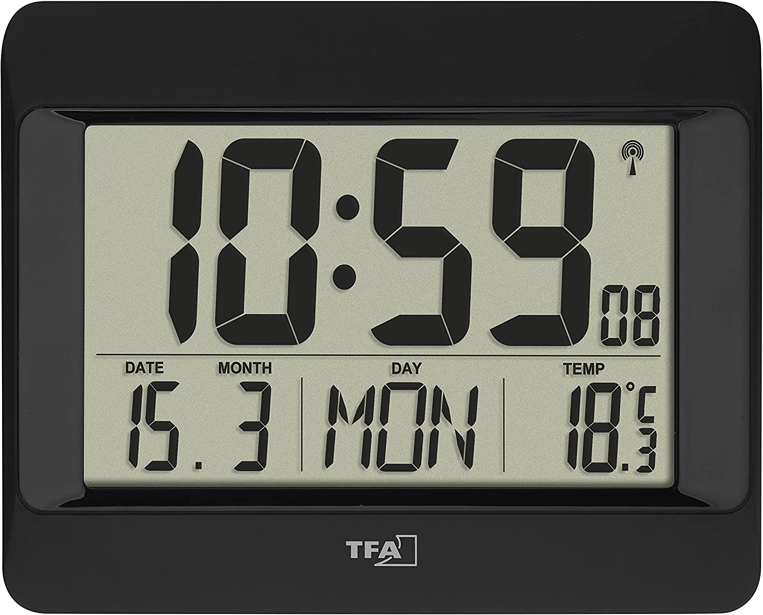 Стенен часовник TFA Dostmann 60.4519.01, Цифров, Батерия, Модерен, Тиха работа, Температура, Календар, Будилник, Черен