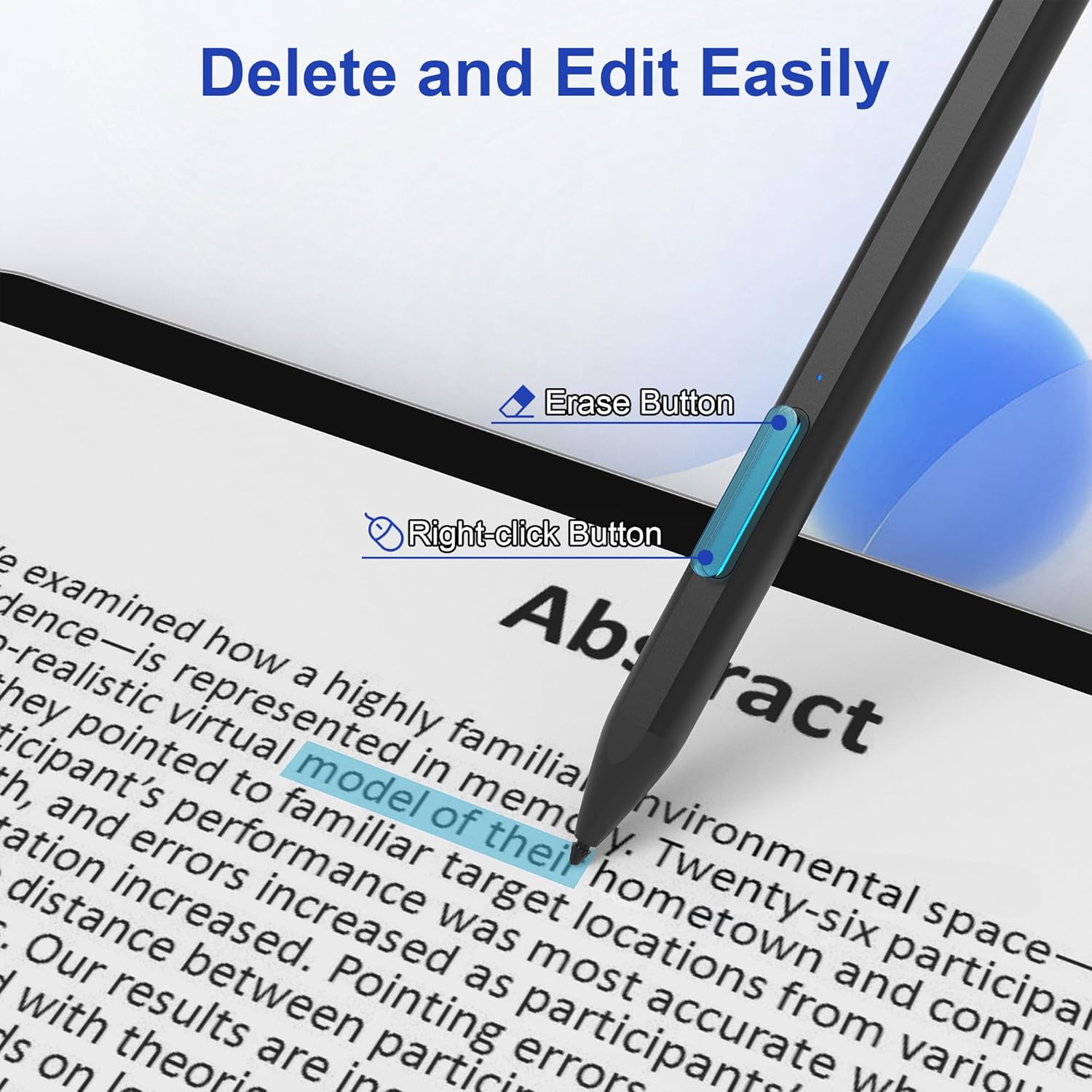 • 【Магнитна адсорбция】Писалката Surface Pro е с магнитен дизайн и може да бъде здраво закрепена към вашия Microsoft Surface Pro/Go/Book/Laptop/Studio по всяко време. Можете да я откачите по всяко време, за да си водите бележки, когато ви хрумне вдъхновение. Идеална за студенти, бизнес професионалисти и творци, които често си водят бележки и рисуват. Дизайнът на писалката Microsoft Surface е с гумичка и функция за щракване с десен бутон. Както е показано на илюстрацията, натиснете продължително, за да изпълните желаната функция.