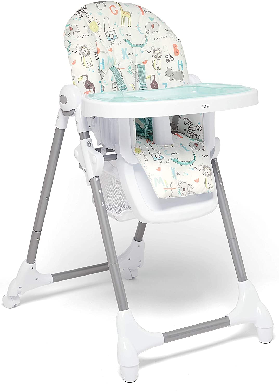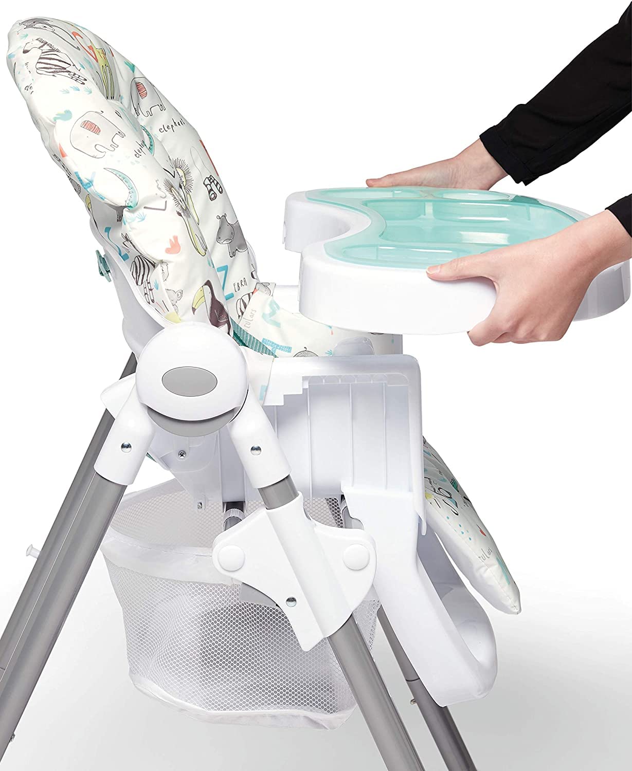 • Този висок стол предлага не само кошница за съхранение на всичко необходимо за храна, но също така може да бъде напълно сгънат с прикрепена дъска за хранене.