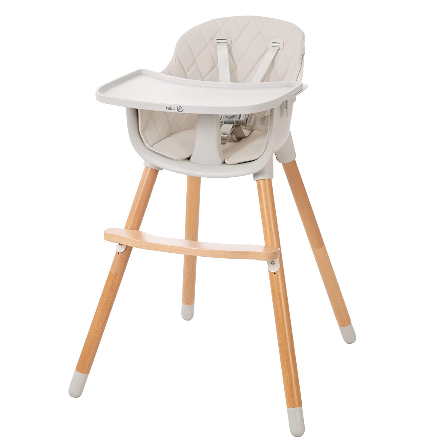 • Столът за хранене 2 в 1 Roba и детският стол с модерен дизайн „styleup Wood“ се предлага със сива подложка от изкуствена кожа за седалка и дъска за хранене. Товароносимост до 15 кг.