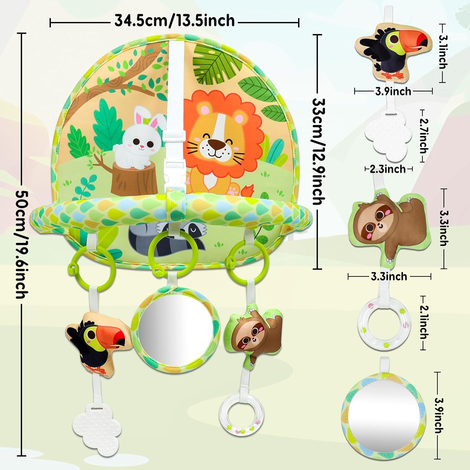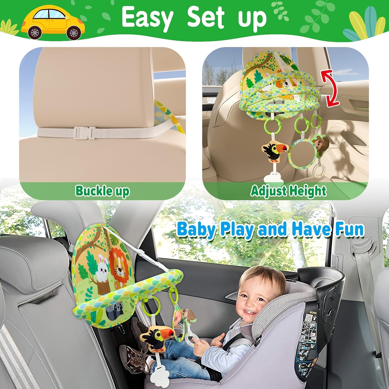 Befestigen Sie das Spielzeugset am Autositz des Kindes und verwenden Sie den Aktivitätsbogen, Spiegel und Plüschspielzeugband, um das Sinnesort des Babys während der Reise zu unterhalten und zu stimulieren.