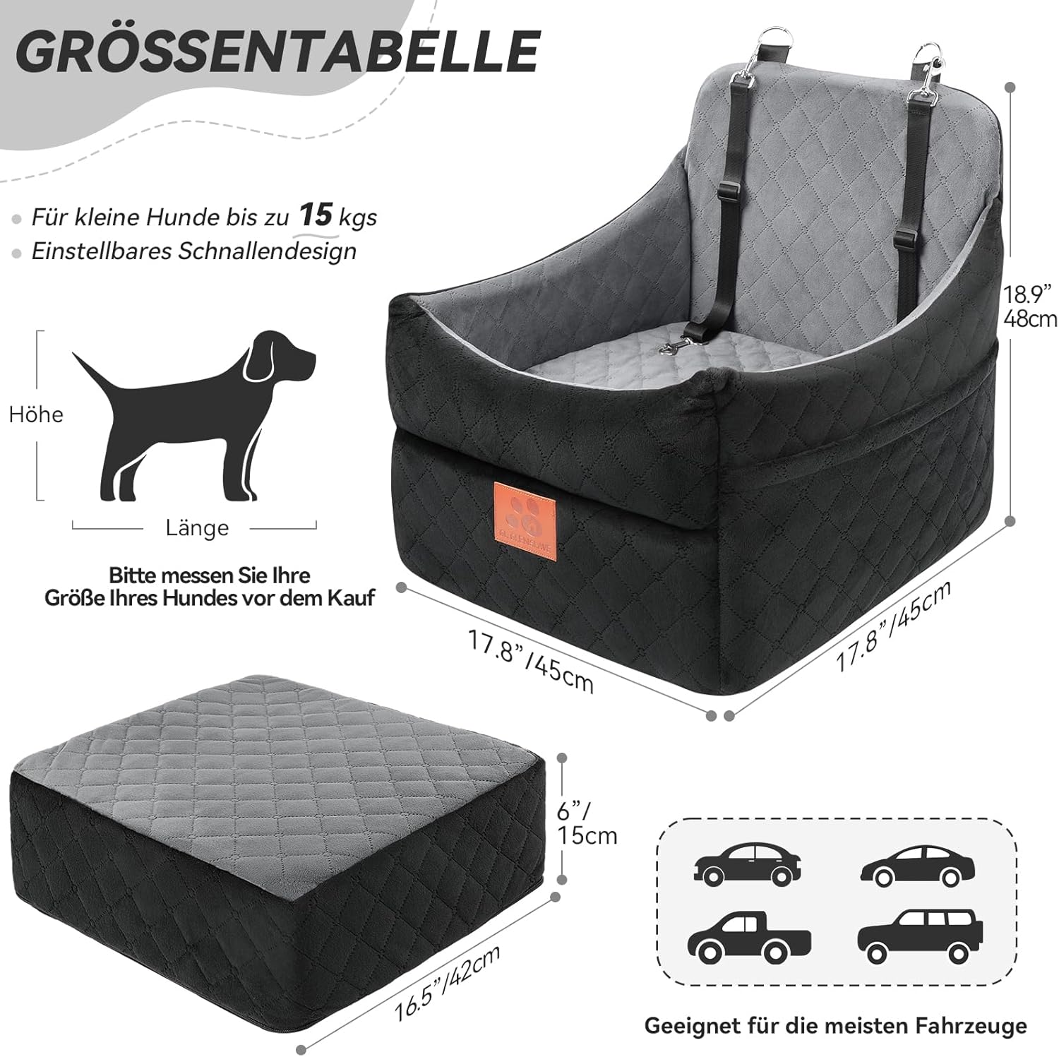 • Столче за кола за кучета: 48 (Д) x 48 (Ш) x 52 (В) см, това столче за кола е подходящо за малки и средни кучета и котки с тегло до 15 кг. Подходящо за предната или задната седалка на автомобили, SUV-ове и камиони, което прави вашия домашен любимец безопасен и безгрижен по време на шофиране.