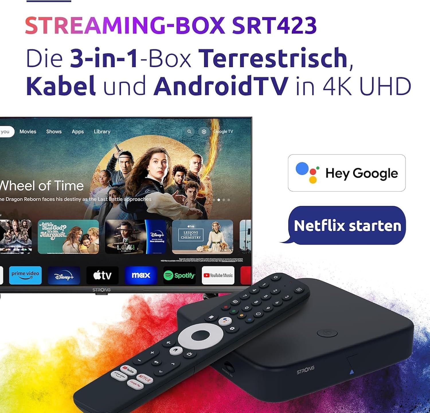 STRONG - Стрийминг бокс Android TV 4K UHD - SRT 423 - Вграден Chromecast - DVB-T2 и кабелен приемник - Гласово управление - Dolby Vision Atmos - Google Play, Netflix, Prime Video, Disney+ - Черен
