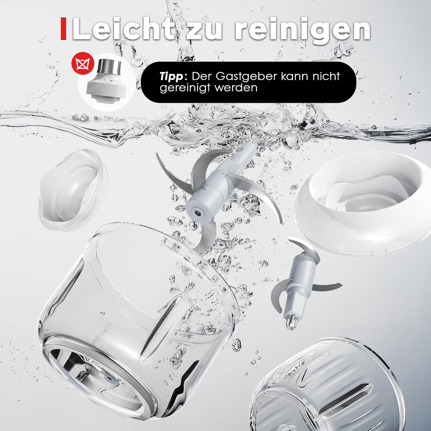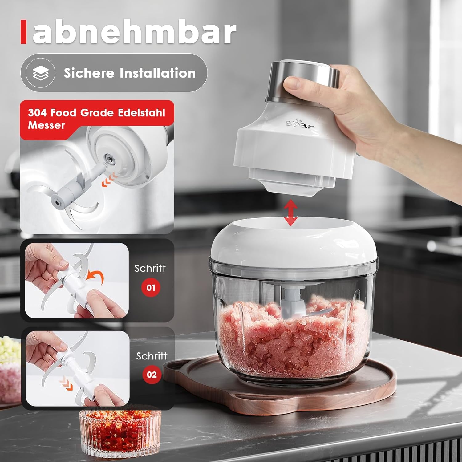 Стъклен чопър Bear 0.6L + 2L 2 нива на скорост, чопър с 4 остриета от неръждаема стомана и месомелачка, стъклен контейнер за месо, бебешка храна, плодове, зеленчуци, електрически мини чопър