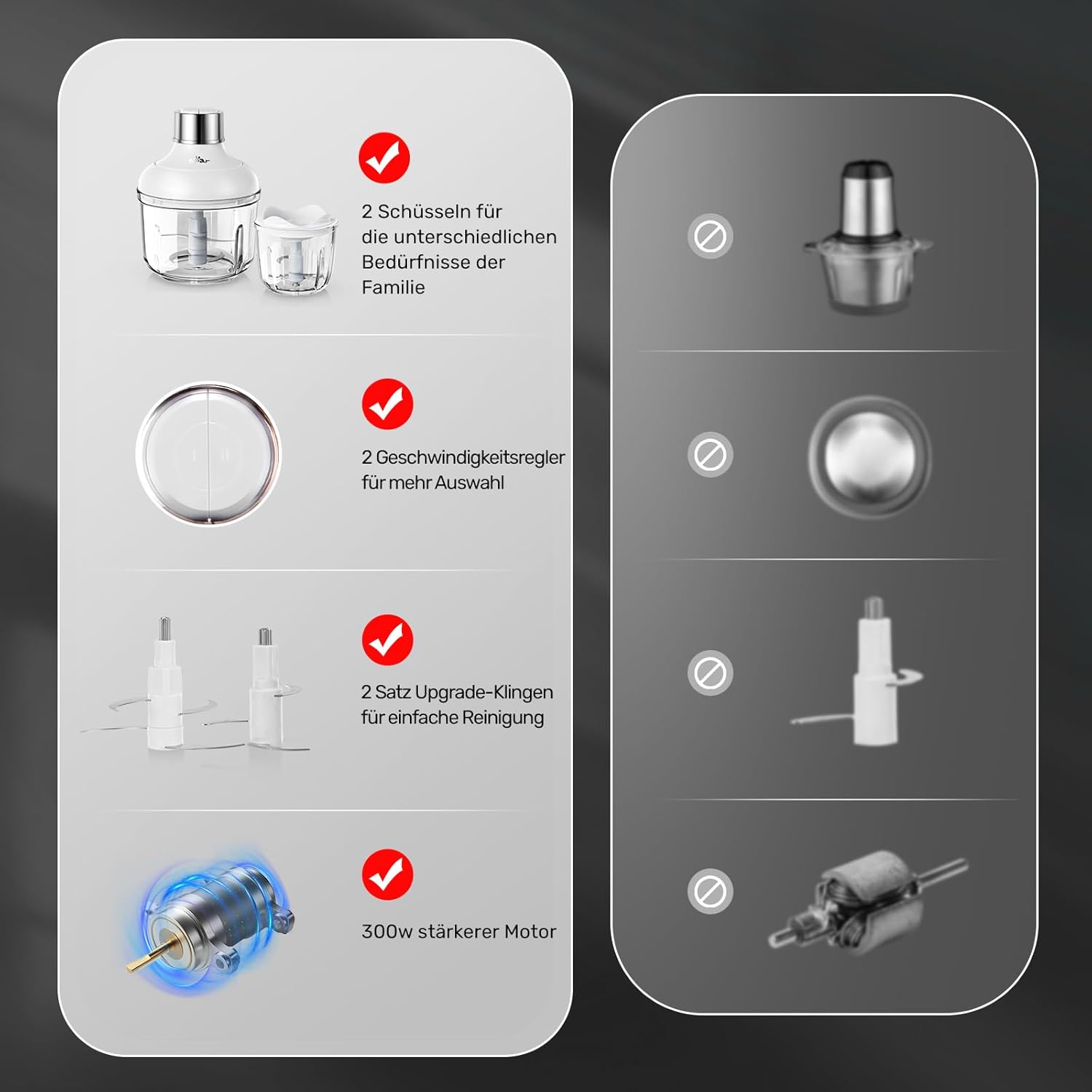 • Два размера: 0,6 л + 2 л, двойна чаша/двоен нож/двоен капак, трислоен остър нож, изработен от неръждаема стомана, за да отговори на различните нужди на кухнята.