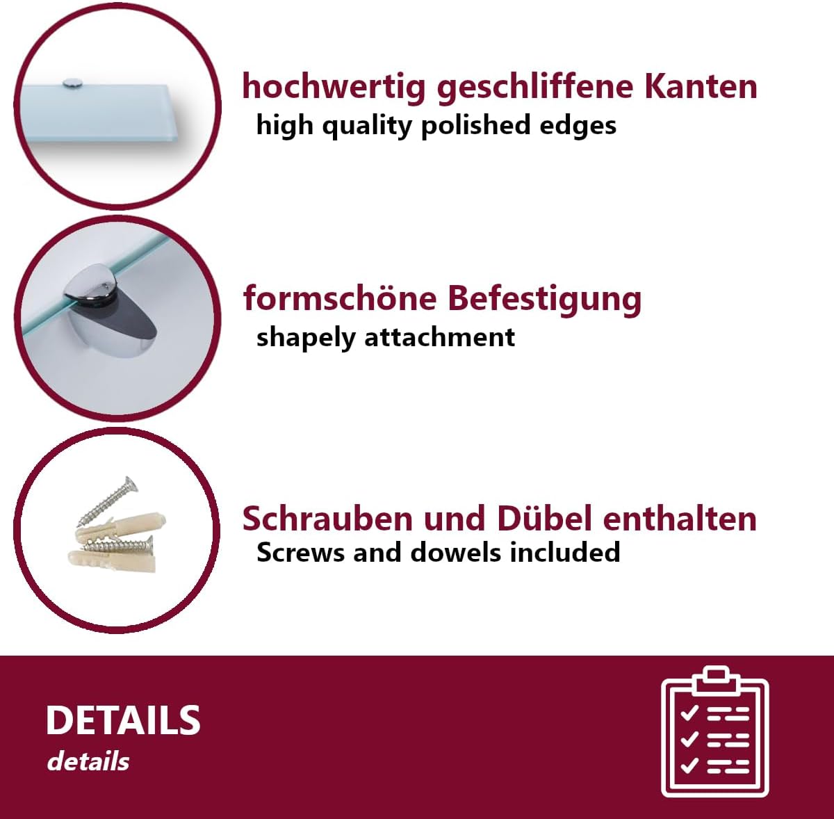 • Лесен монтаж: бързо и безопасно монтиран с алуминиеви скоби, включително винтове, без дюбели, стъкленият рафт разширява пространството ви за съхранение не само в банята. Универсална употреба.